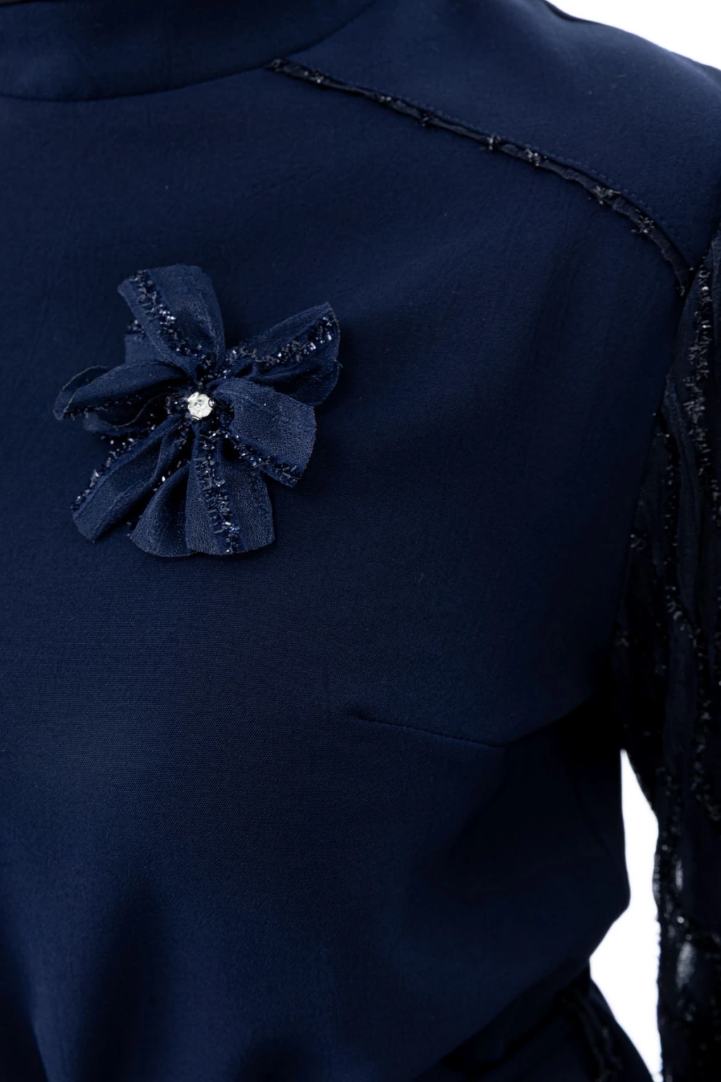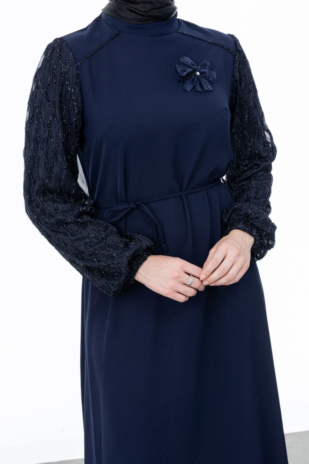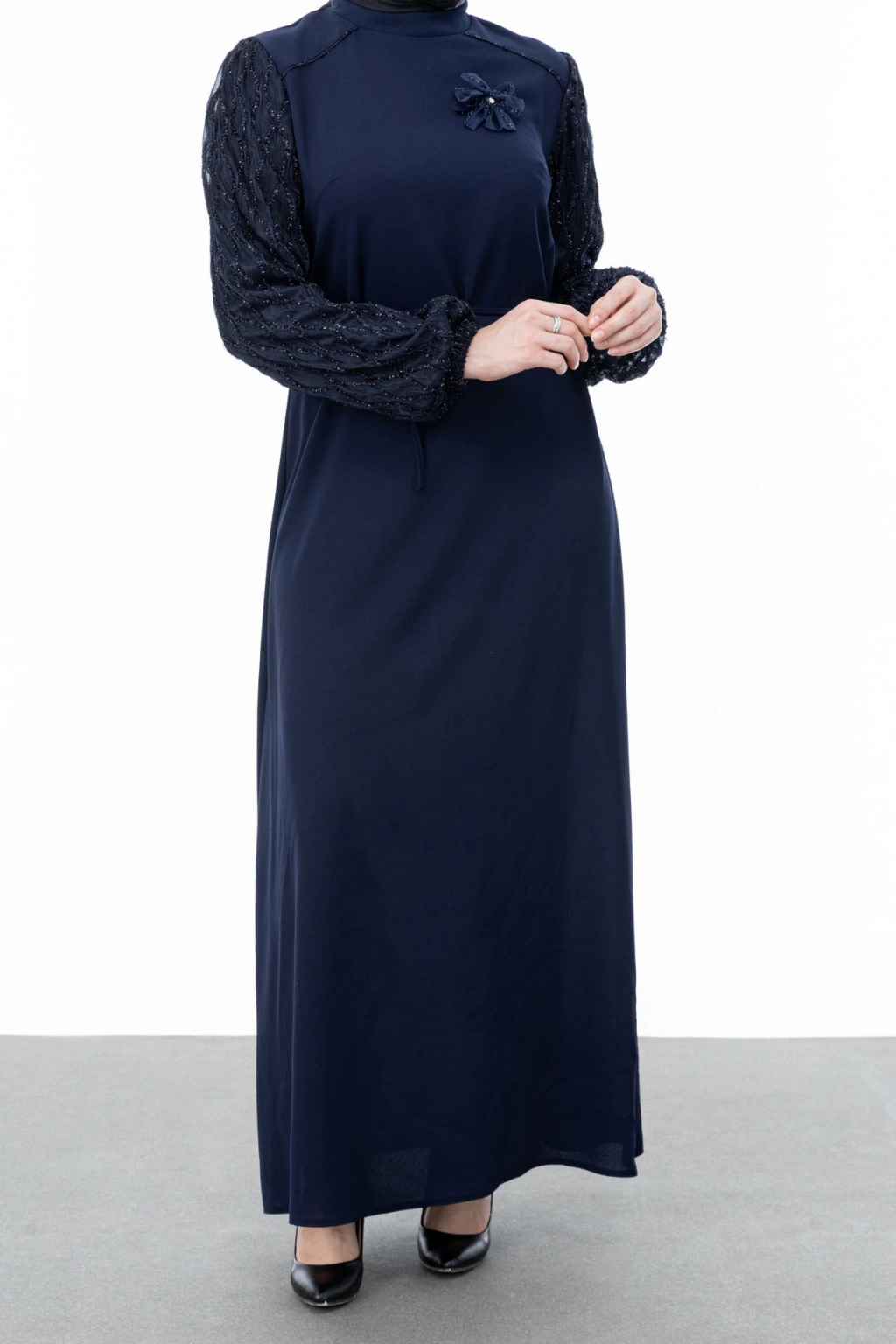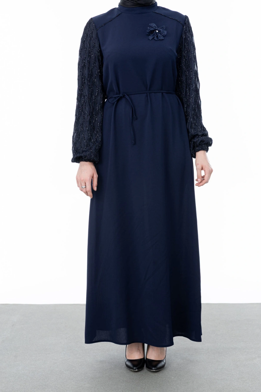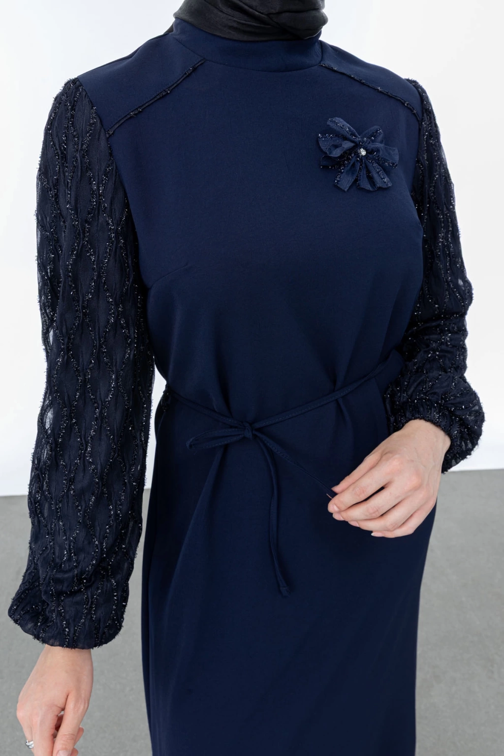 Ürün Adı: GARNİ KUMAŞLI BROŞLU ELBİSE - LACİVERT