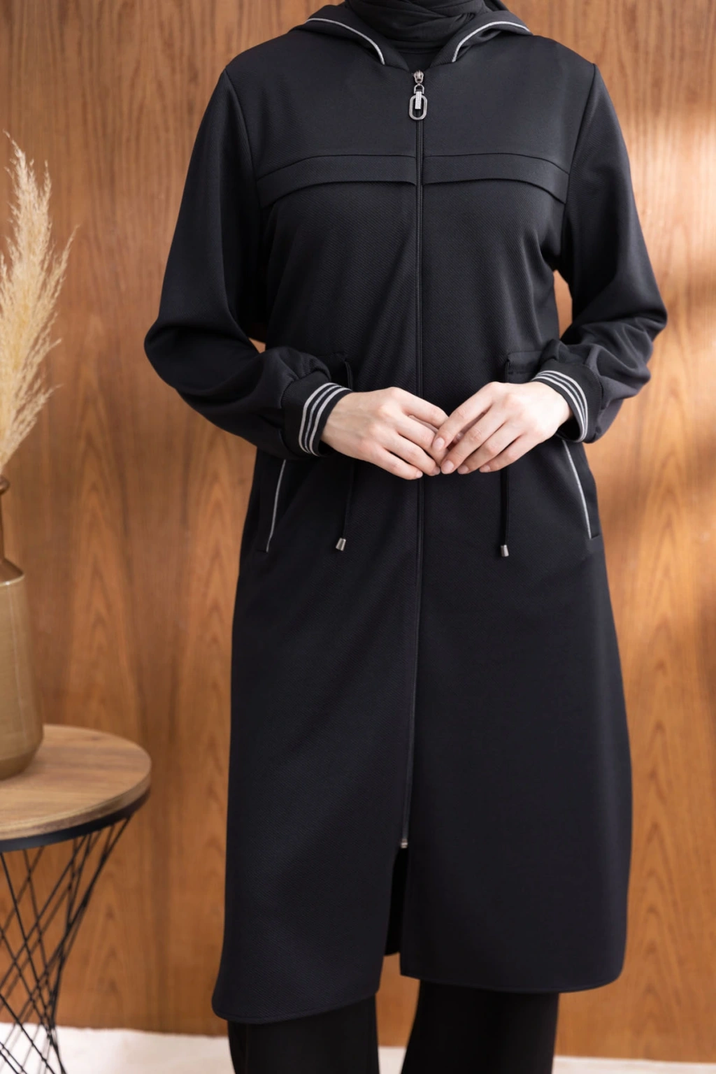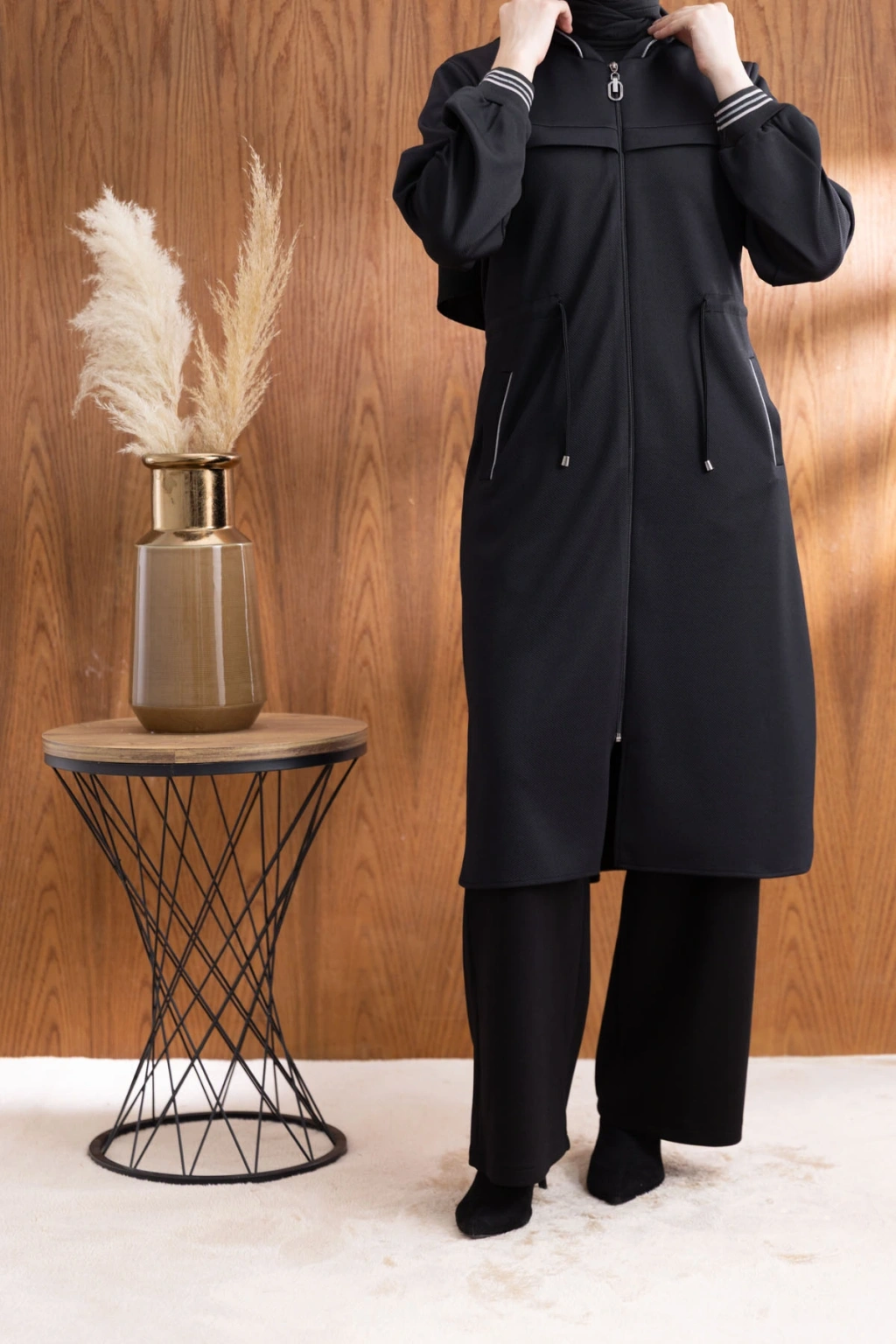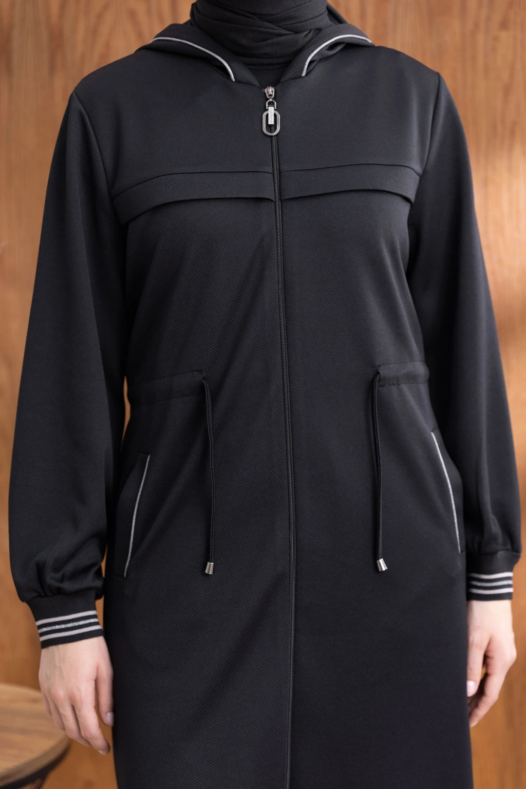 KAPÜŞONLU RİBANA VE ALLER DETAYLI GİYÇIK - SİYAH, şıklığı ve rahatlığı bir araya getiren benzersiz bir tasarımdır. Yüksek kaliteli kumaşı ve zarif detayları ile hem günlük kullanıma hem de özel günlere uygun olarak tasarlanmıştır.