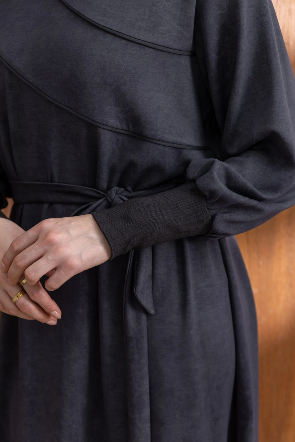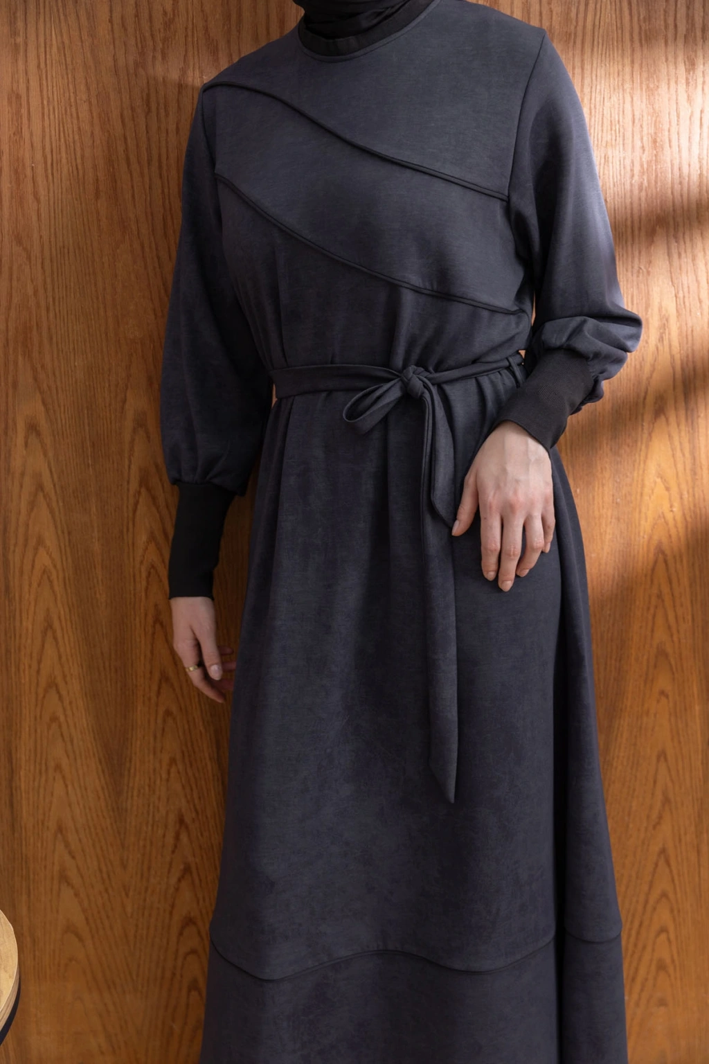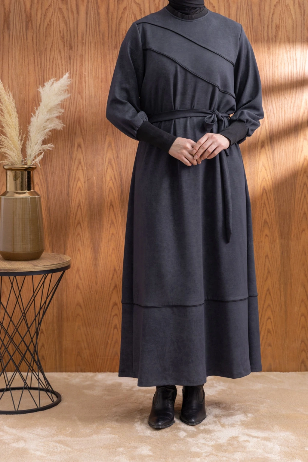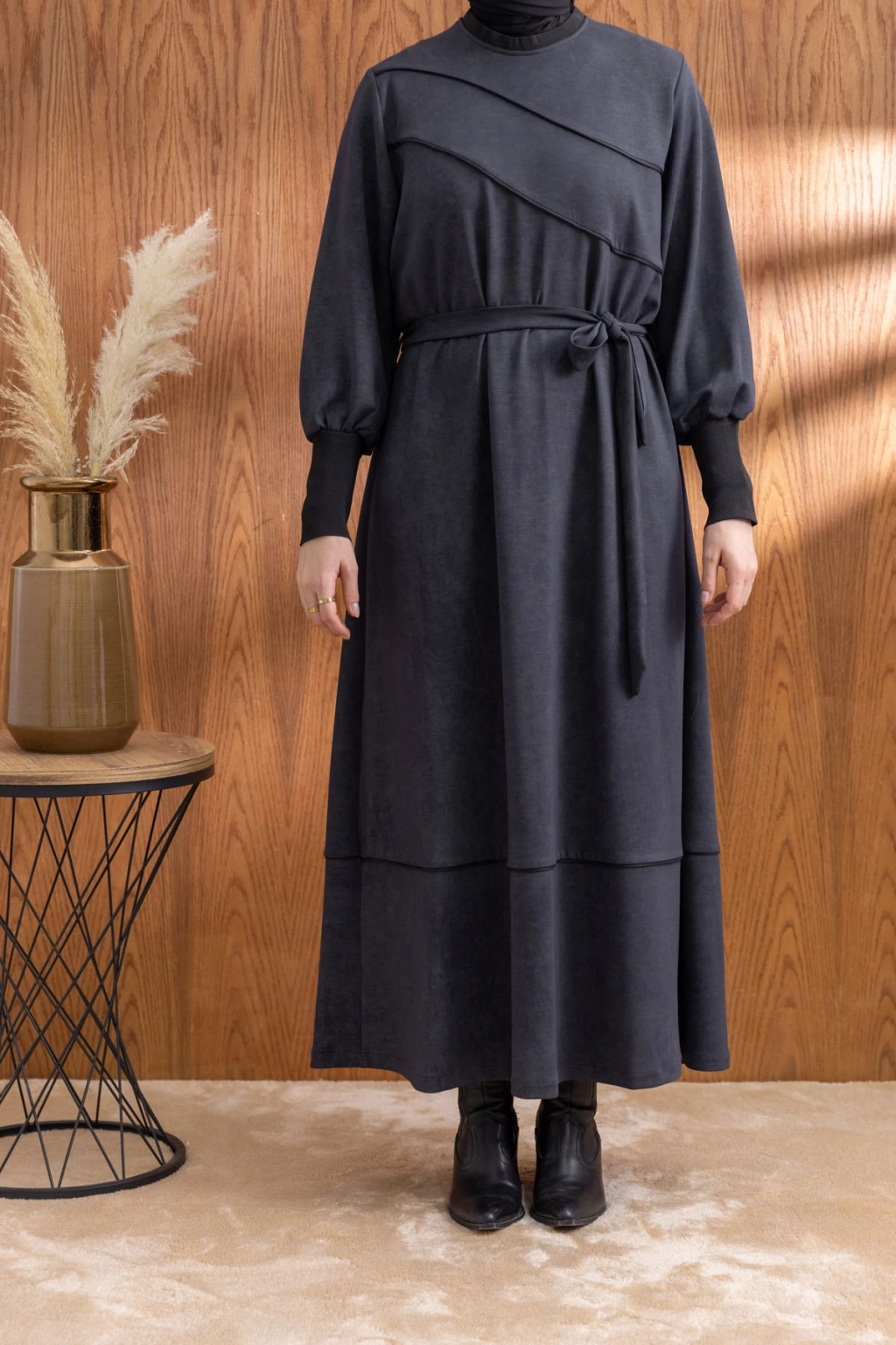 KOLLARI VE YAKASI RİBANALI ELBİSE - ANTRASİT, şıklığı ve rahatlığı bir araya getiren benzersiz bir tasarımdır. Yüksek kaliteli kumaşı ve zarif detayları ile hem günlük kullanıma hem de özel günlere uygun olarak tasarlanmıştır.