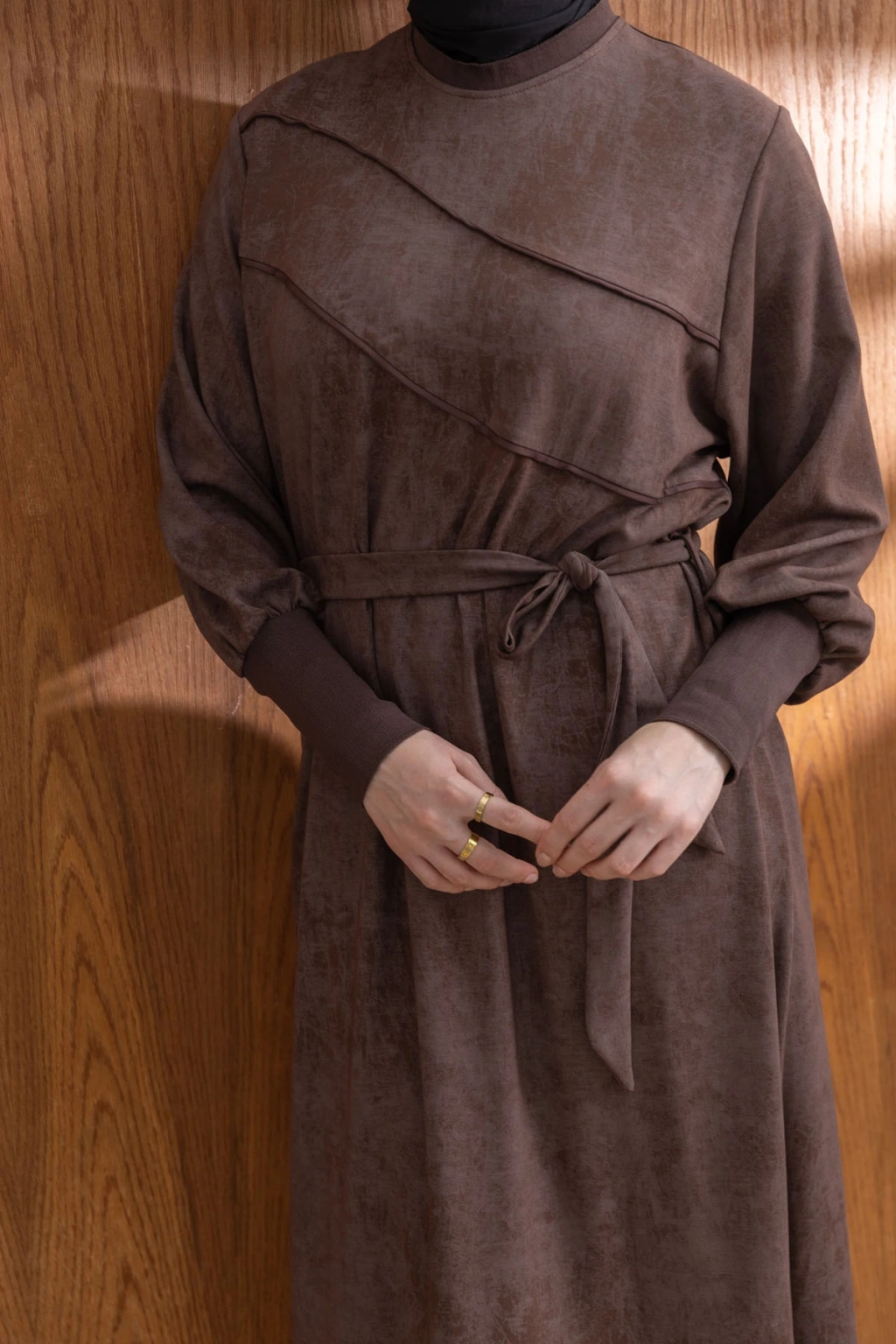 KOLLARI VE YAKASI RİBANALI ELBİSE - KAHVE, şıklığı ve rahatlığı bir araya getiren benzersiz bir tasarımdır. Yüksek kaliteli kumaşı ve zarif detayları ile hem günlük kullanıma hem de özel günlere uygun olarak tasarlanmıştır.