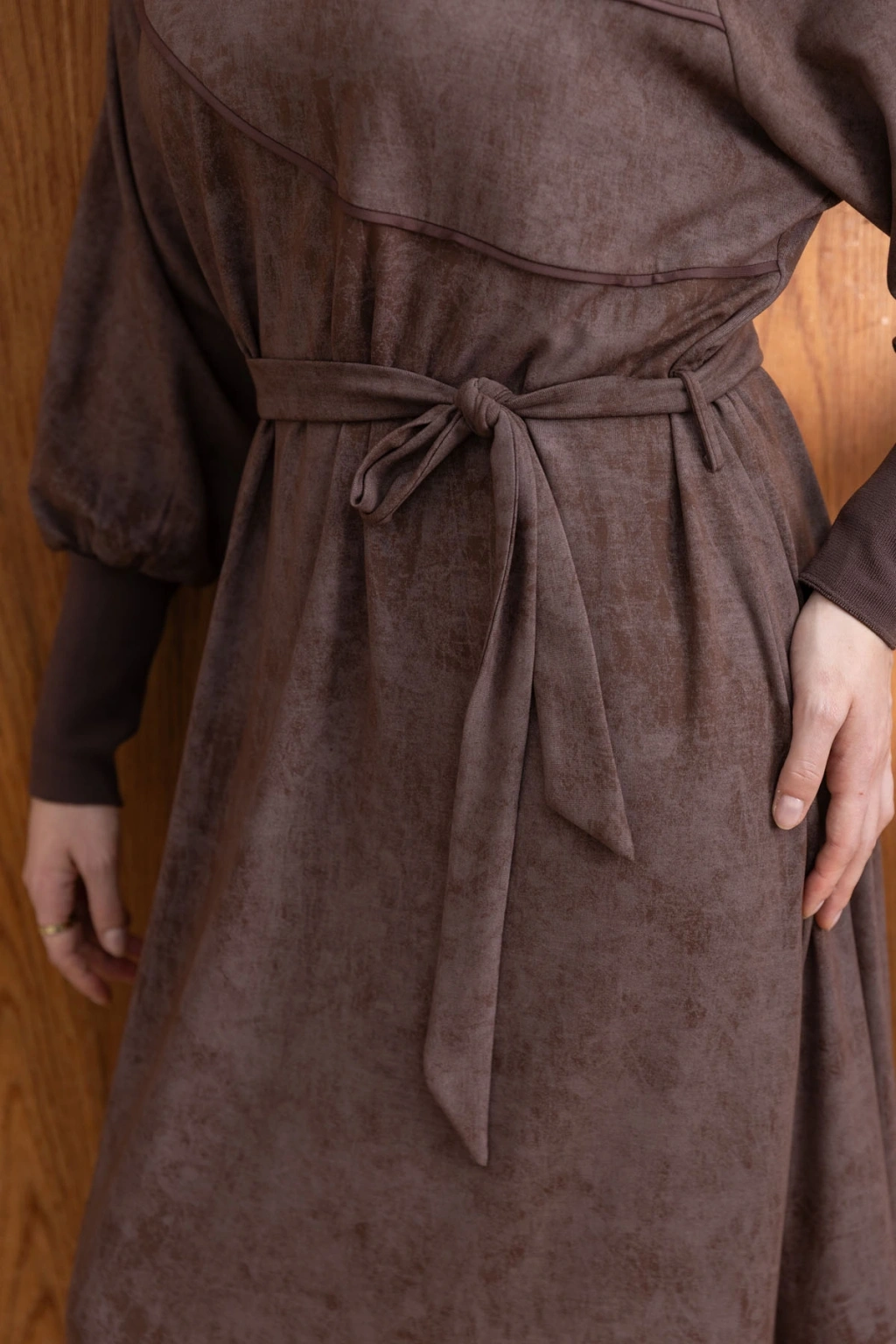 Ürün Adı: KOLLARI VE YAKASI RİBANALI ELBİSE - KAHVE