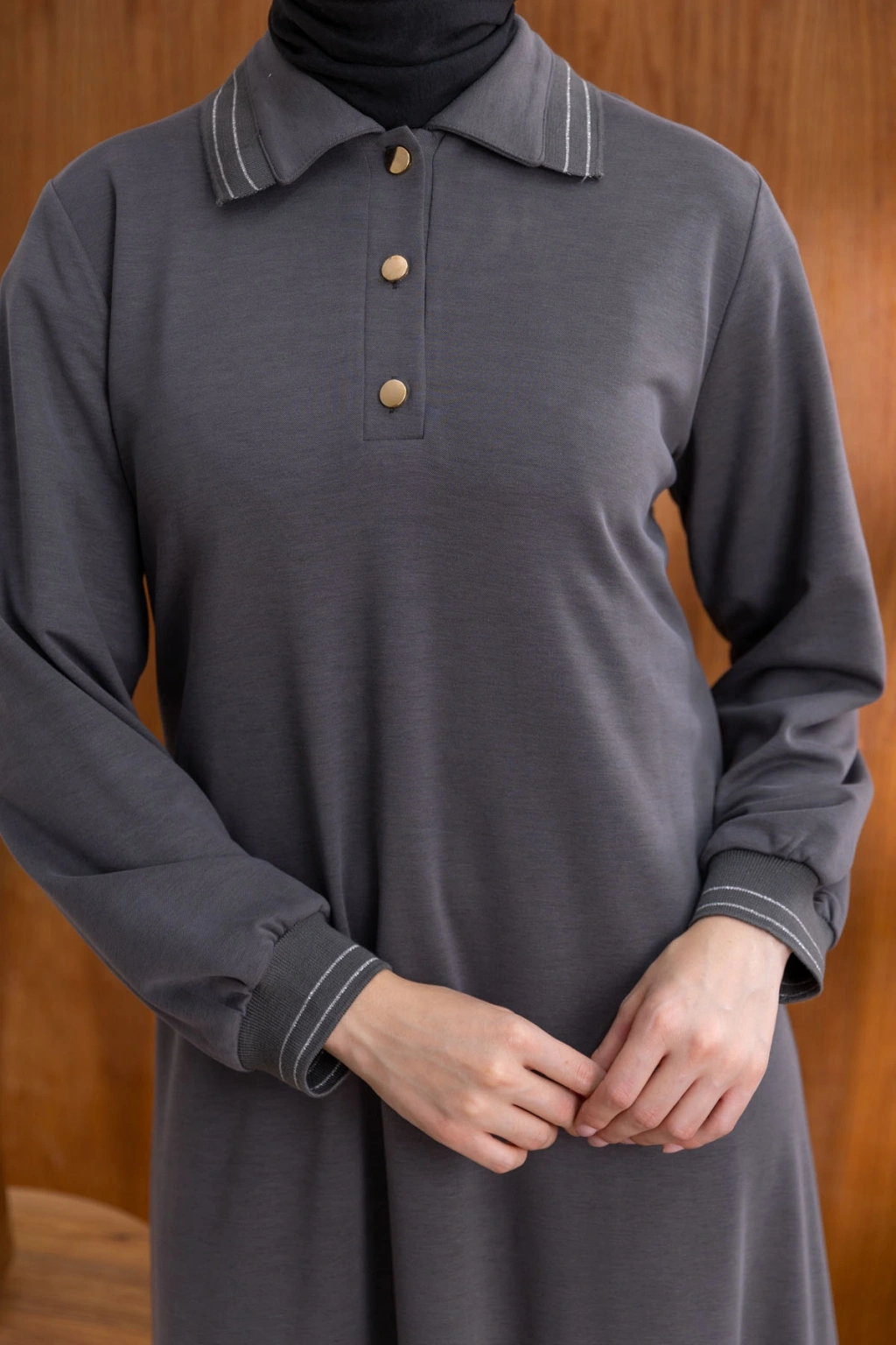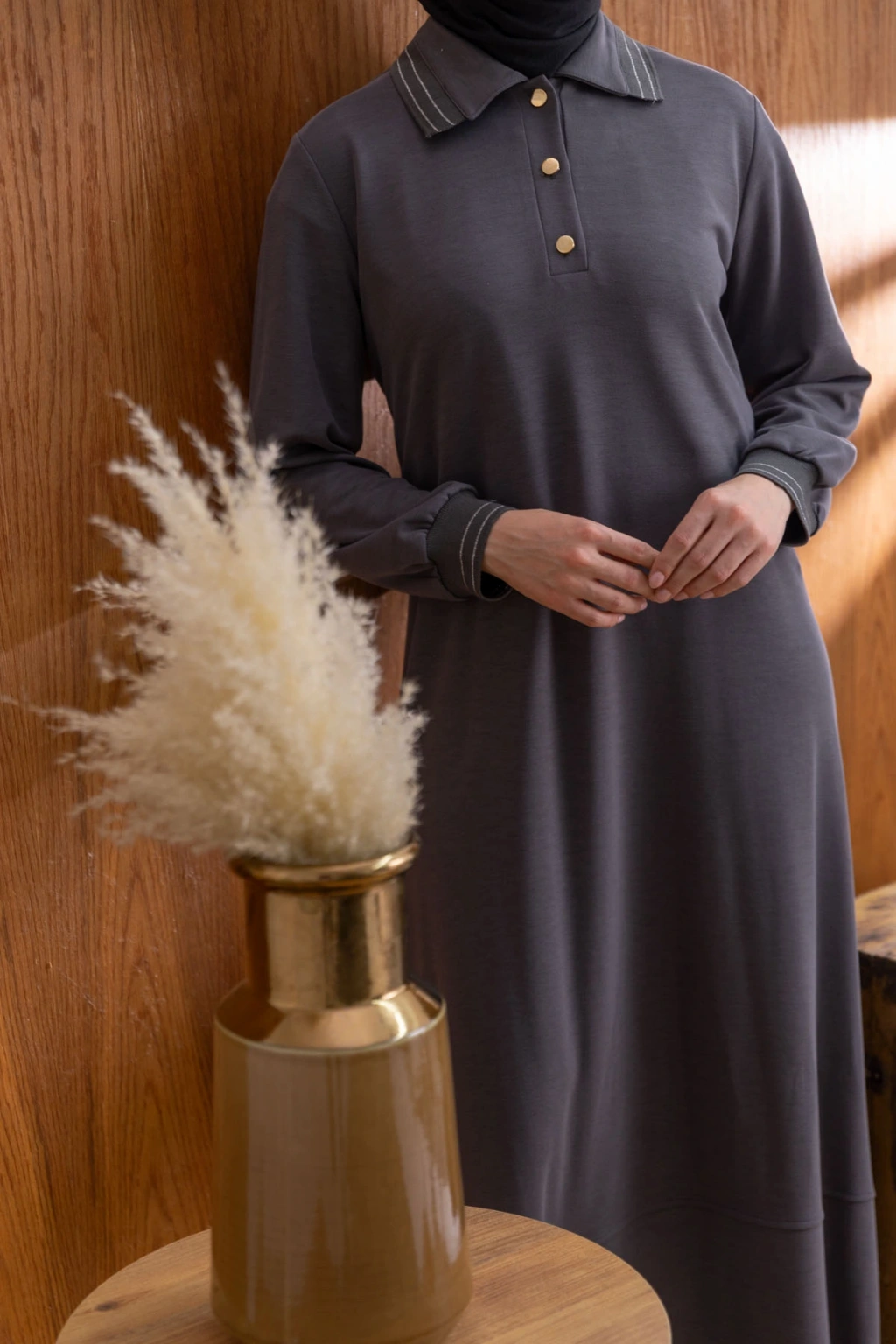 Ürün Adı: YAKASI VE MANŞETİ RİBANALI ELBİSE - ANTRASİT