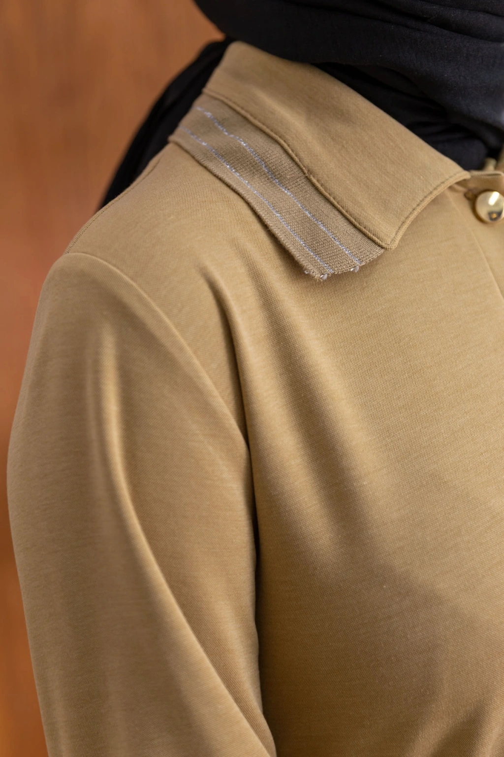YAKASI VE MANŞETİ RİBANALI ELBİSE - HARDAL, şıklığı ve rahatlığı bir araya getiren benzersiz bir tasarımdır. Yüksek kaliteli kumaşı ve zarif detayları ile hem günlük kullanıma hem de özel günlere uygun olarak tasarlanmıştır.