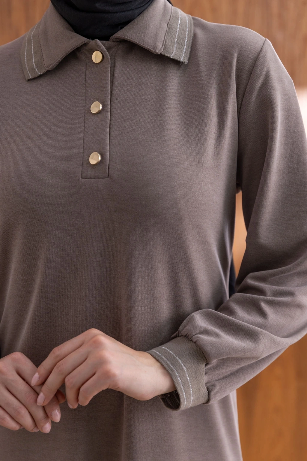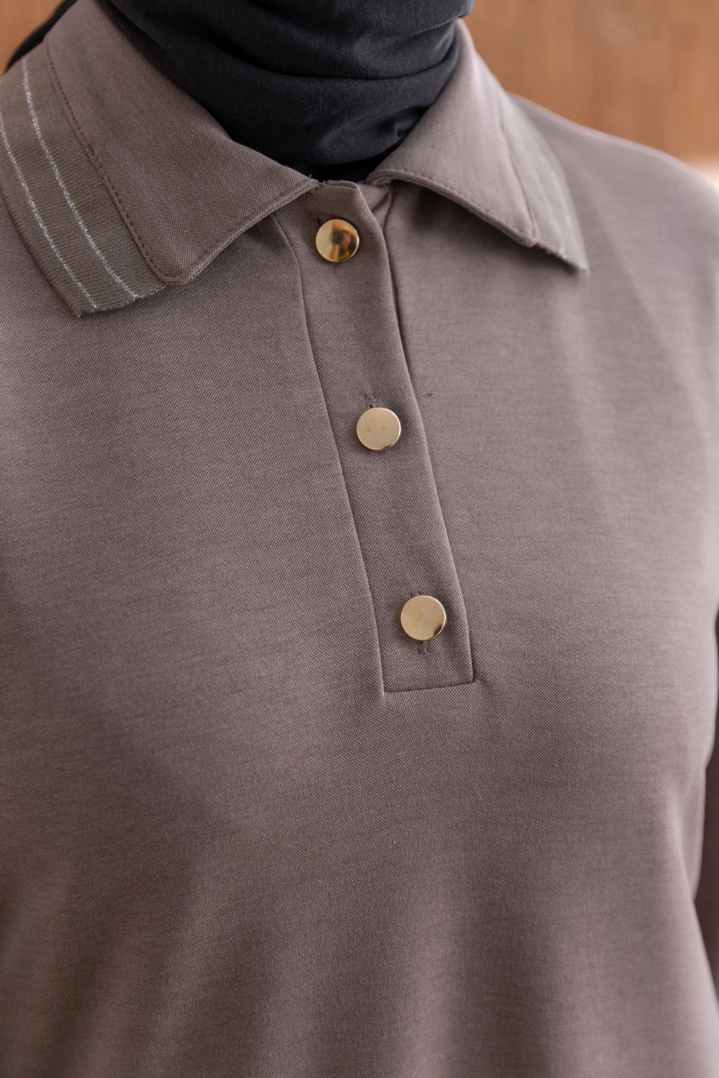 Ürün Adı: YAKASI VE MANŞETİ RİBANALI ELBİSE - VİZON
