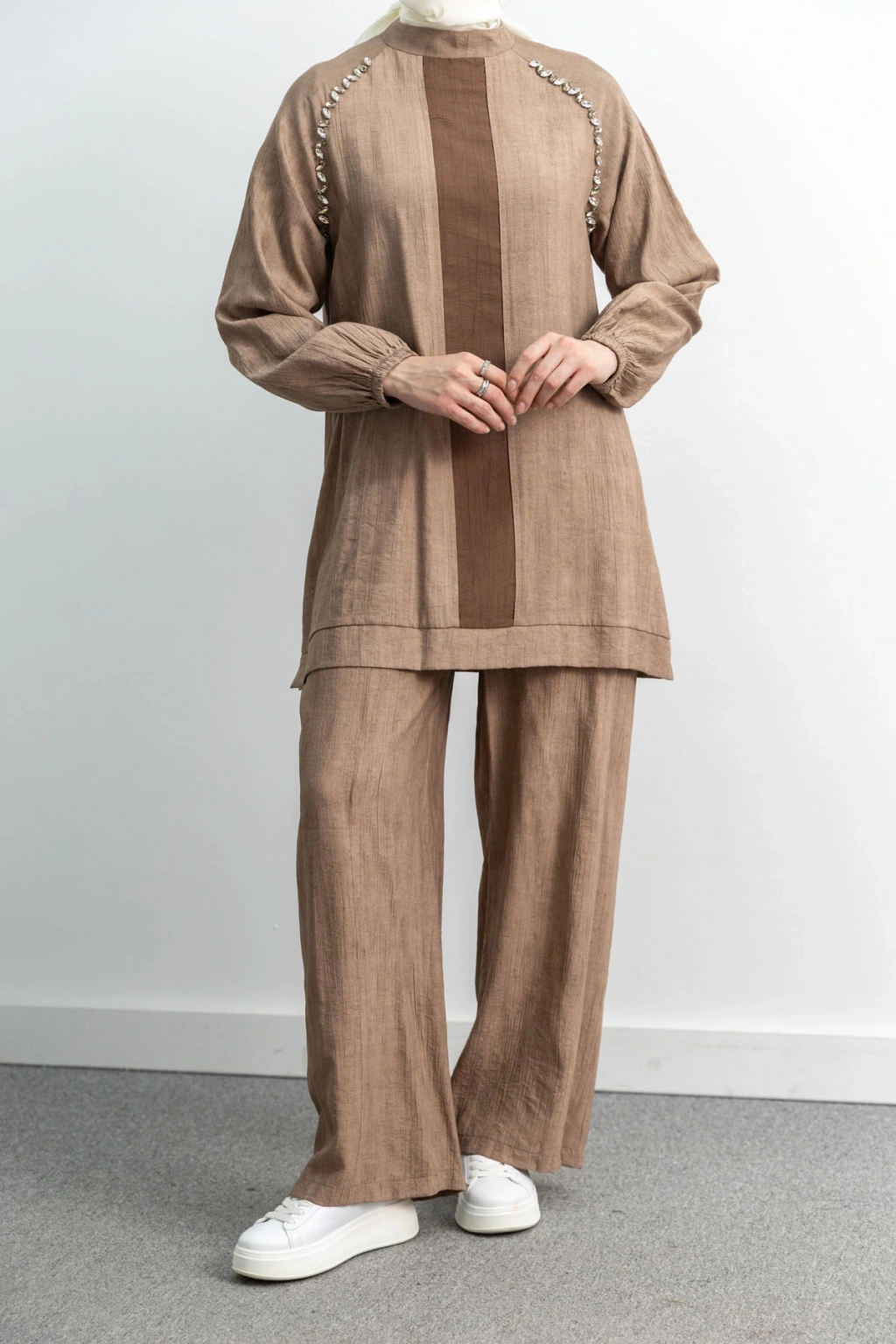 LETAFET 4071 PANTOLONLU TAKIM - VİZON, şıklığı ve rahatlığı bir araya getiren benzersiz bir tasarımdır. Yüksek kaliteli kumaşı ve zarif detayları ile hem günlük kullanıma hem de özel günlere uygun olarak tasarlanmıştır.