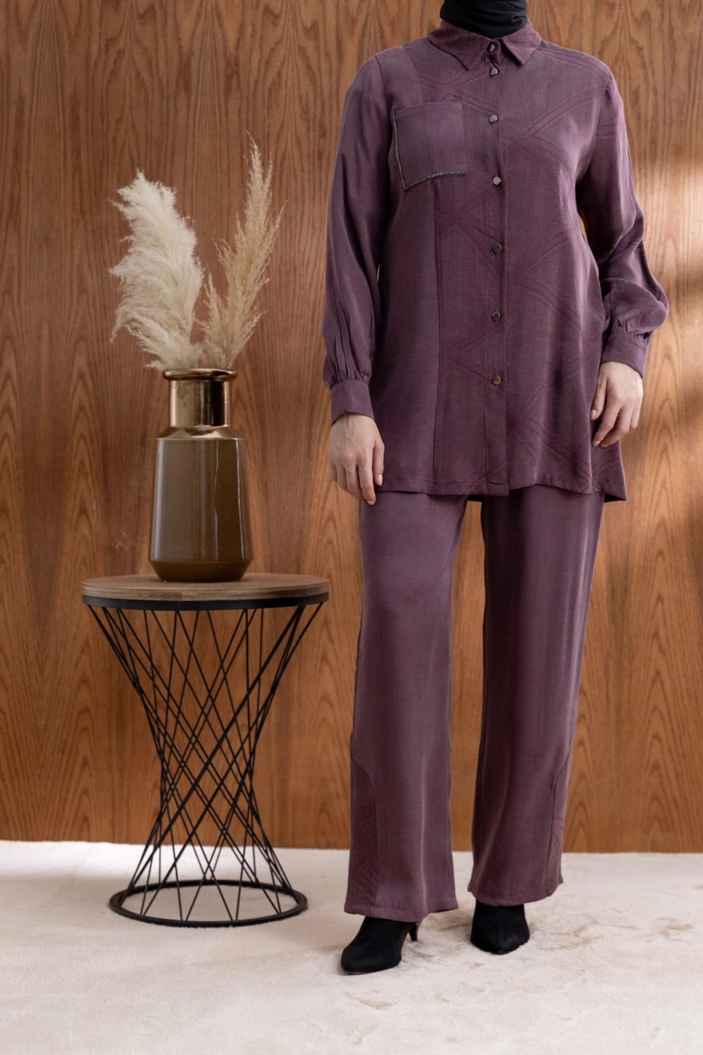 CEBİ TAŞ DETAYLI ÖNÜ DÜĞMELİ PANTOLONLU TAKIM - MÜRDÜM, şıklığı ve rahatlığı bir araya getiren benzersiz bir tasarımdır. Yüksek kaliteli kumaşı ve zarif detayları ile hem günlük kullanıma hem de özel günlere uygun olarak tasarlanmıştır.