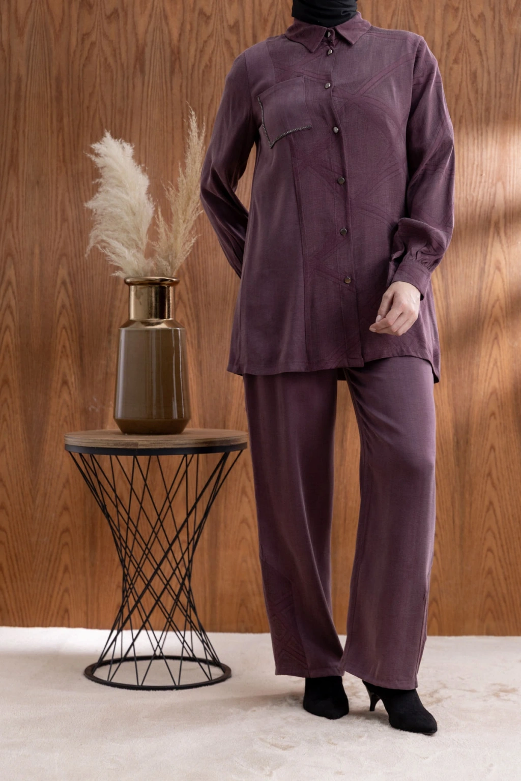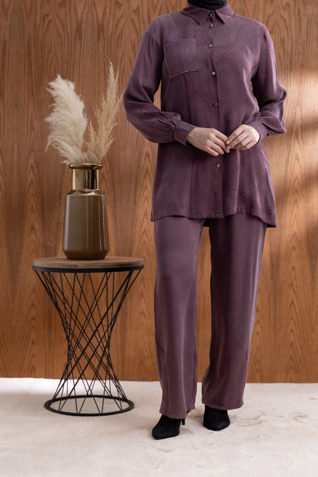 CEBİ TAŞ DETAYLI ÖNÜ DÜĞMELİ PANTOLONLU TAKIM - MÜRDÜM ile tarzınızı yansıtın ve her ortamda fark yaratın. Şimdi LETAFET kalitesiyle sahip olun ve gardırobunuza yenilik katın!