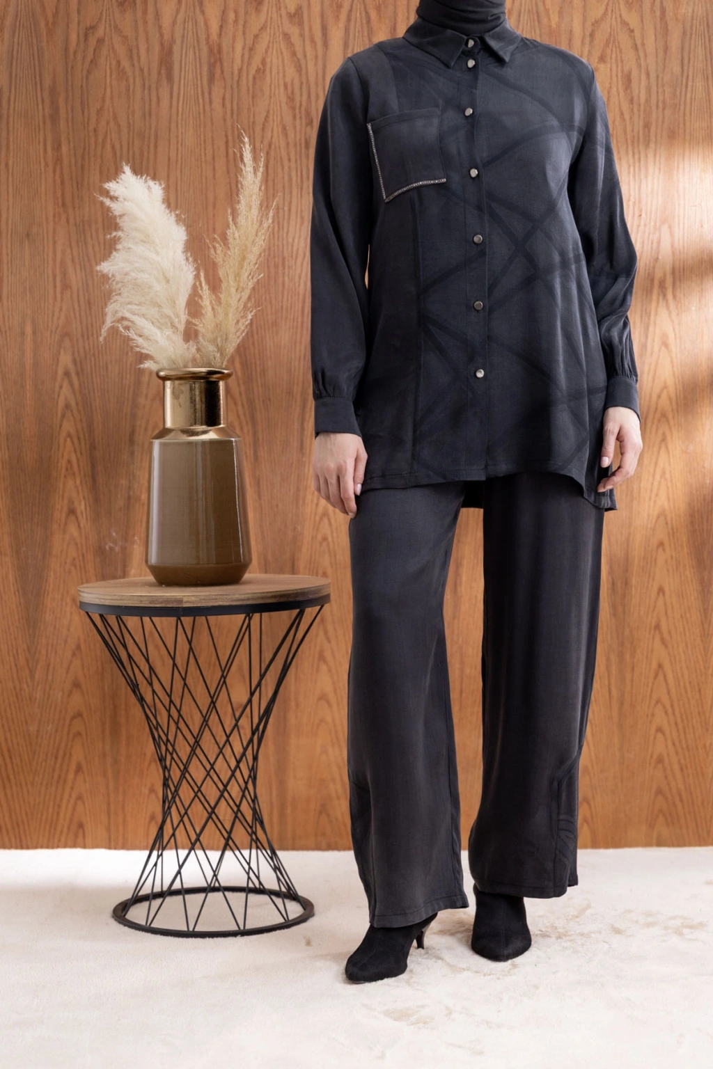 CEBİ TAŞ DETAYLI ÖNÜ DÜĞMELİ PANTOLONLU TAKIM - SİYAH, şıklığı ve rahatlığı bir araya getiren benzersiz bir tasarımdır. Yüksek kaliteli kumaşı ve zarif detayları ile hem günlük kullanıma hem de özel günlere uygun olarak tasarlanmıştır.
