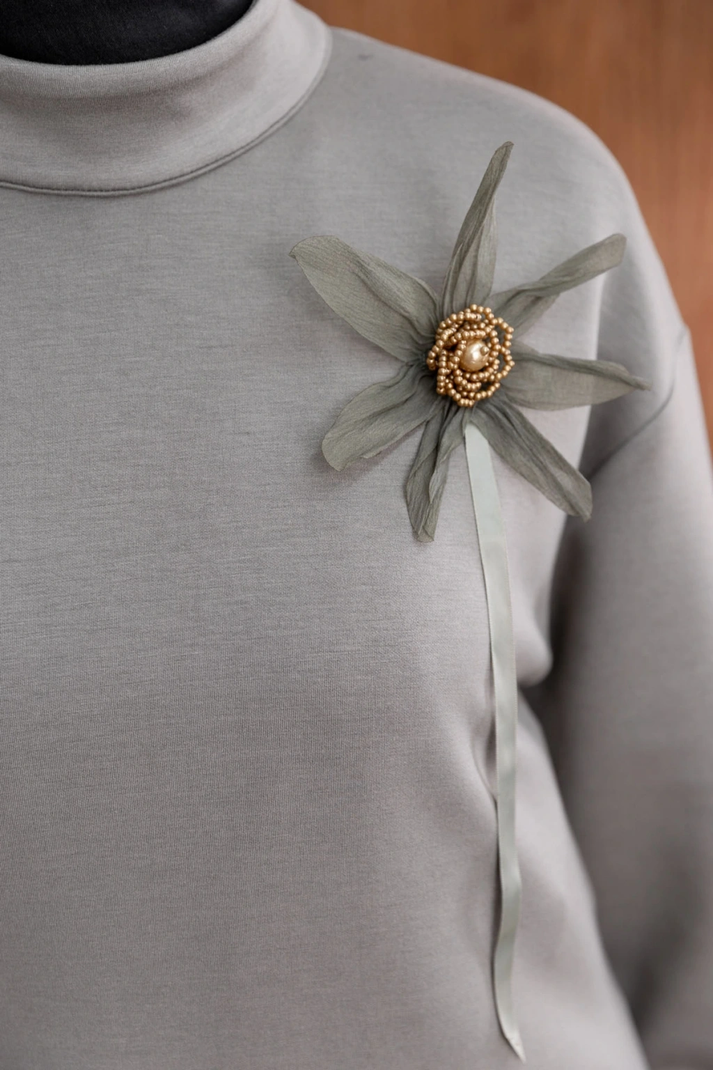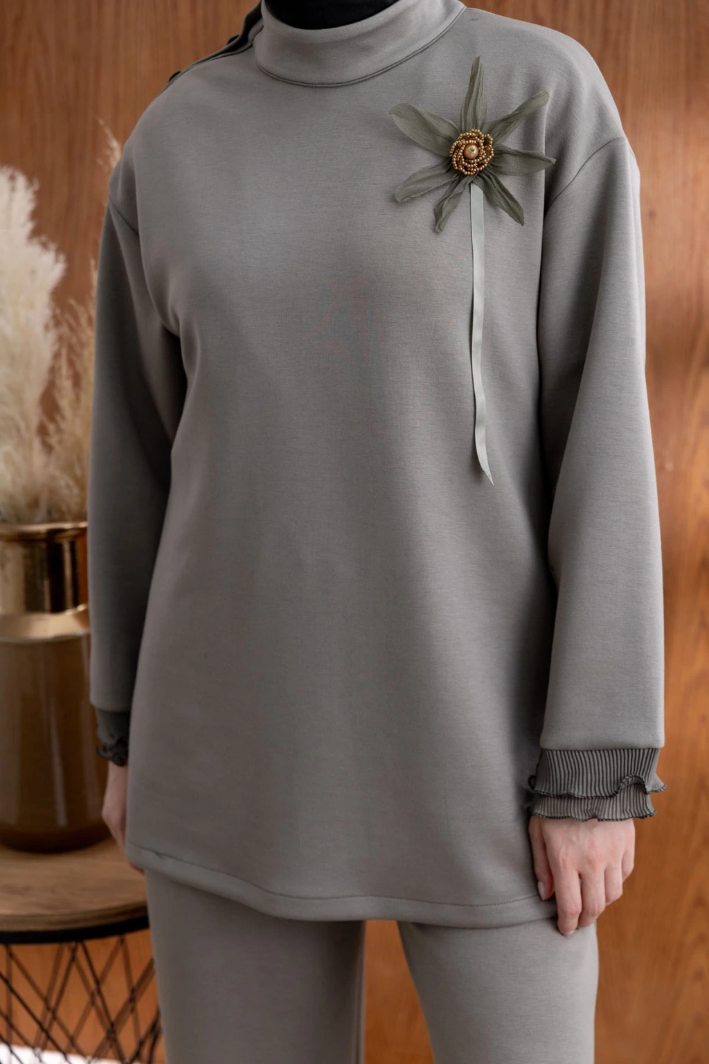 Ürün Adı: KOLU PİLİSE DETAYLI BROŞLU PANTOLONLU TAKIM - HAKİ