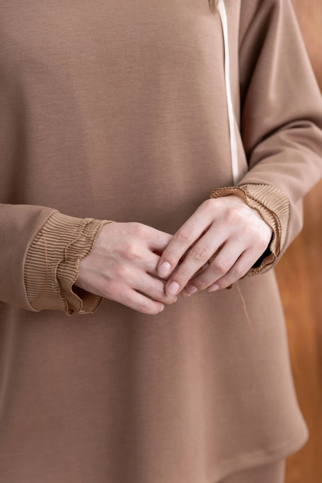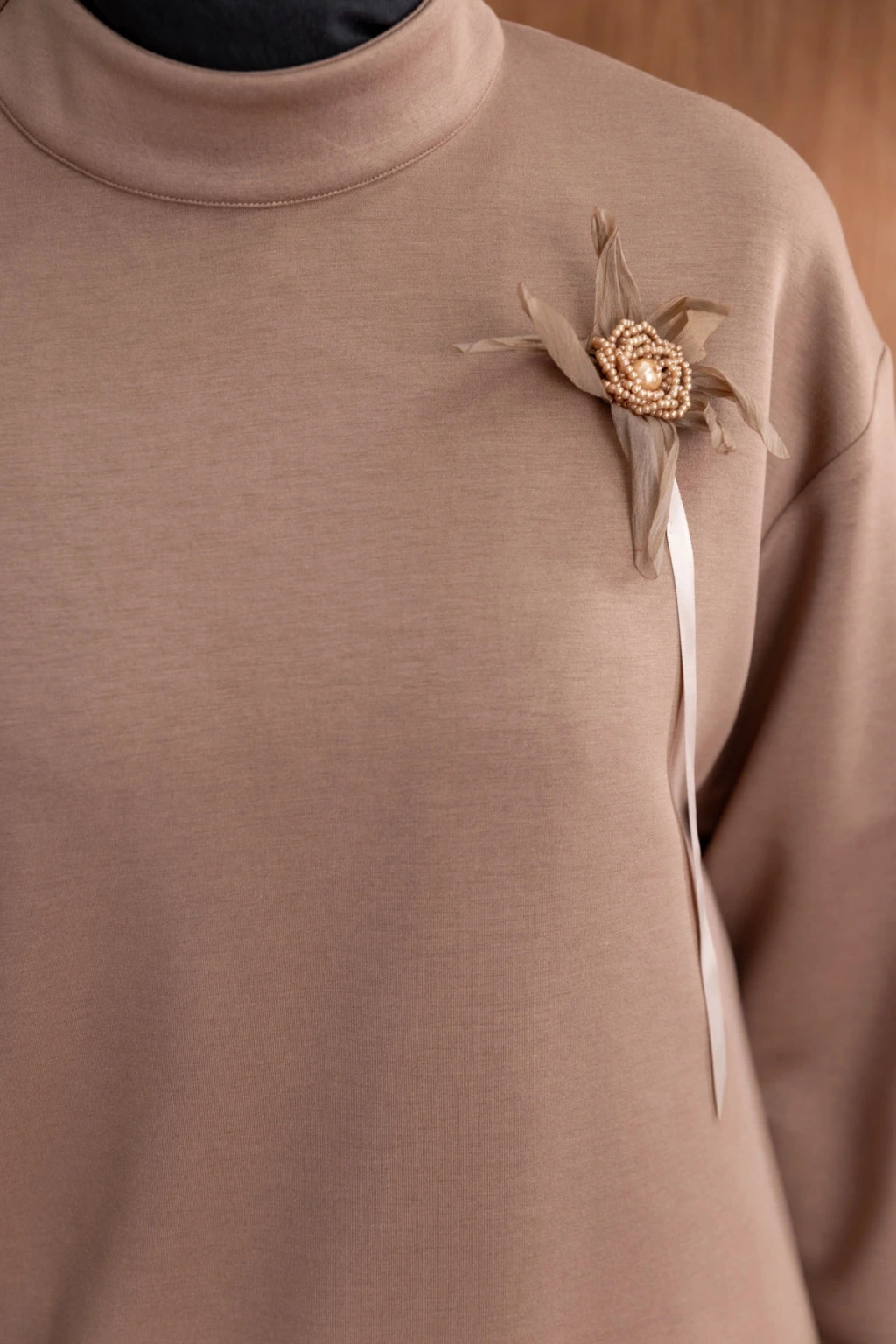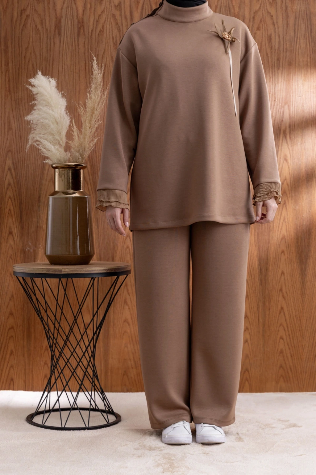 Ürün Adı: KOLU PİLİSE DETAYLI BROŞLU PANTOLONLU TAKIM - KOYU KAHVE