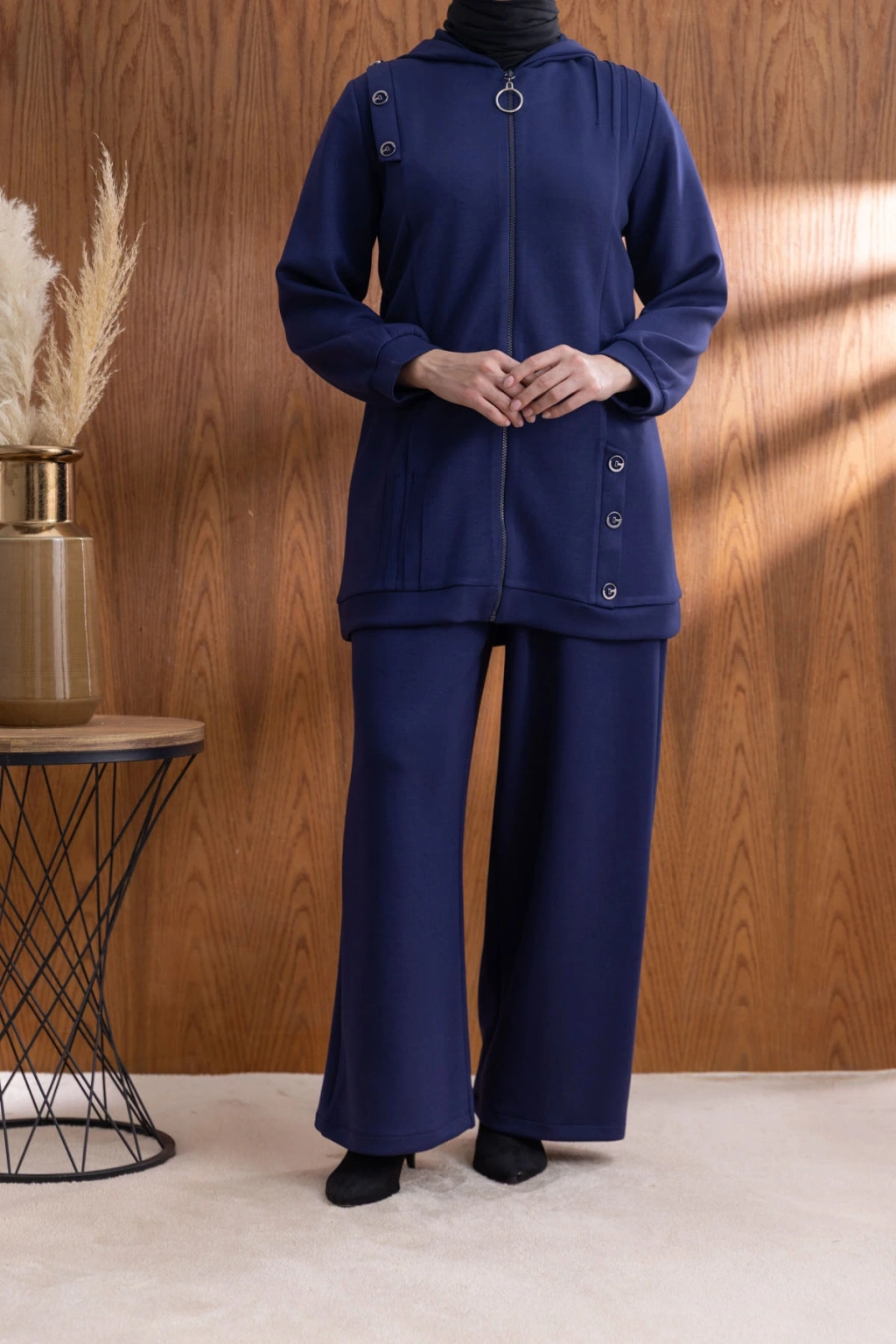 Letafet Kapüşonlu Düğme Detaylı Ceketli Pantolonlu Takım - LACİVERT, şıklığı ve rahatlığı bir araya getiren benzersiz bir tasarımdır. Yüksek kaliteli kumaşı ve zarif detayları ile hem günlük kullanıma hem de özel günlere uygun olarak tasarlanmıştır.