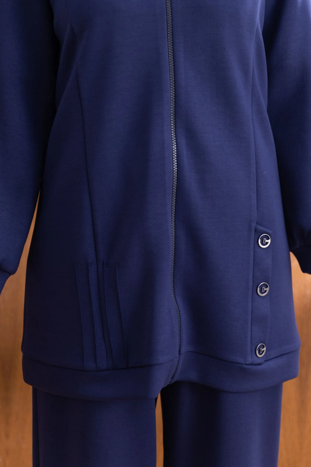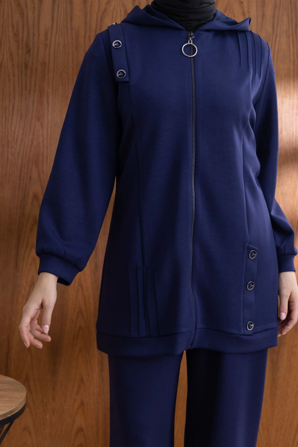 Ürün Adı: Letafet Kapüşonlu Düğme Detaylı Ceketli Pantolonlu Takım - LACİVERT