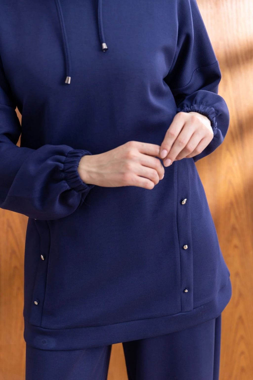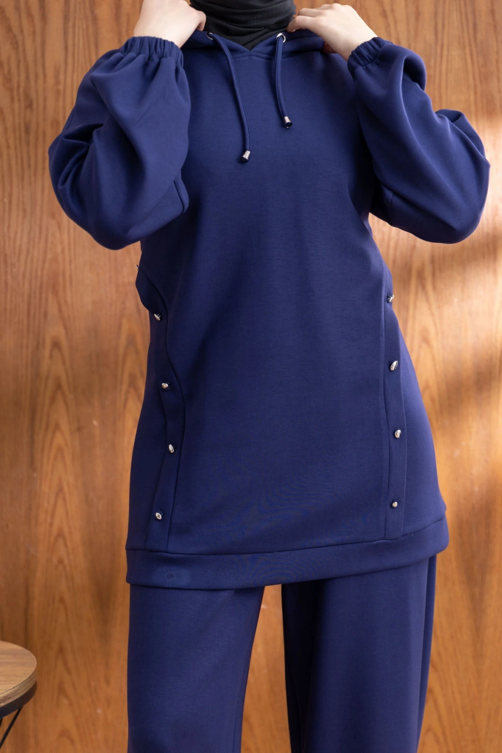 Ürün Adı: LETAFET DÜĞME ŞERİT DETAYLI KAPÜŞONLU PANTOLONLU TAKIM - LACİVERT