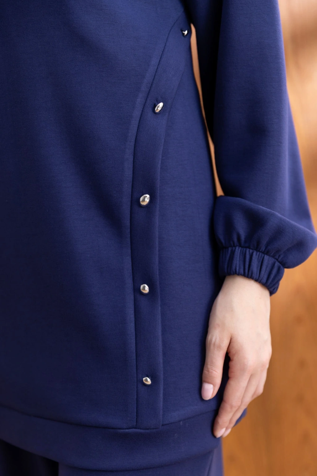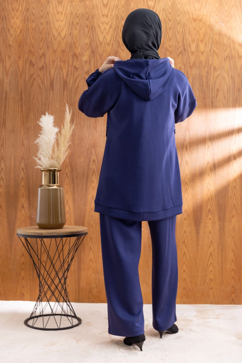 LETAFET DÜĞME ŞERİT DETAYLI KAPÜŞONLU PANTOLONLU TAKIM - LACİVERT, şıklığı ve rahatlığı bir araya getiren benzersiz bir tasarımdır. Yüksek kaliteli kumaşı ve zarif detayları ile hem günlük kullanıma hem de özel günlere uygun olarak tasarlanmıştır.