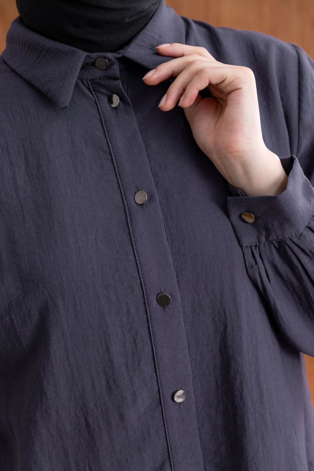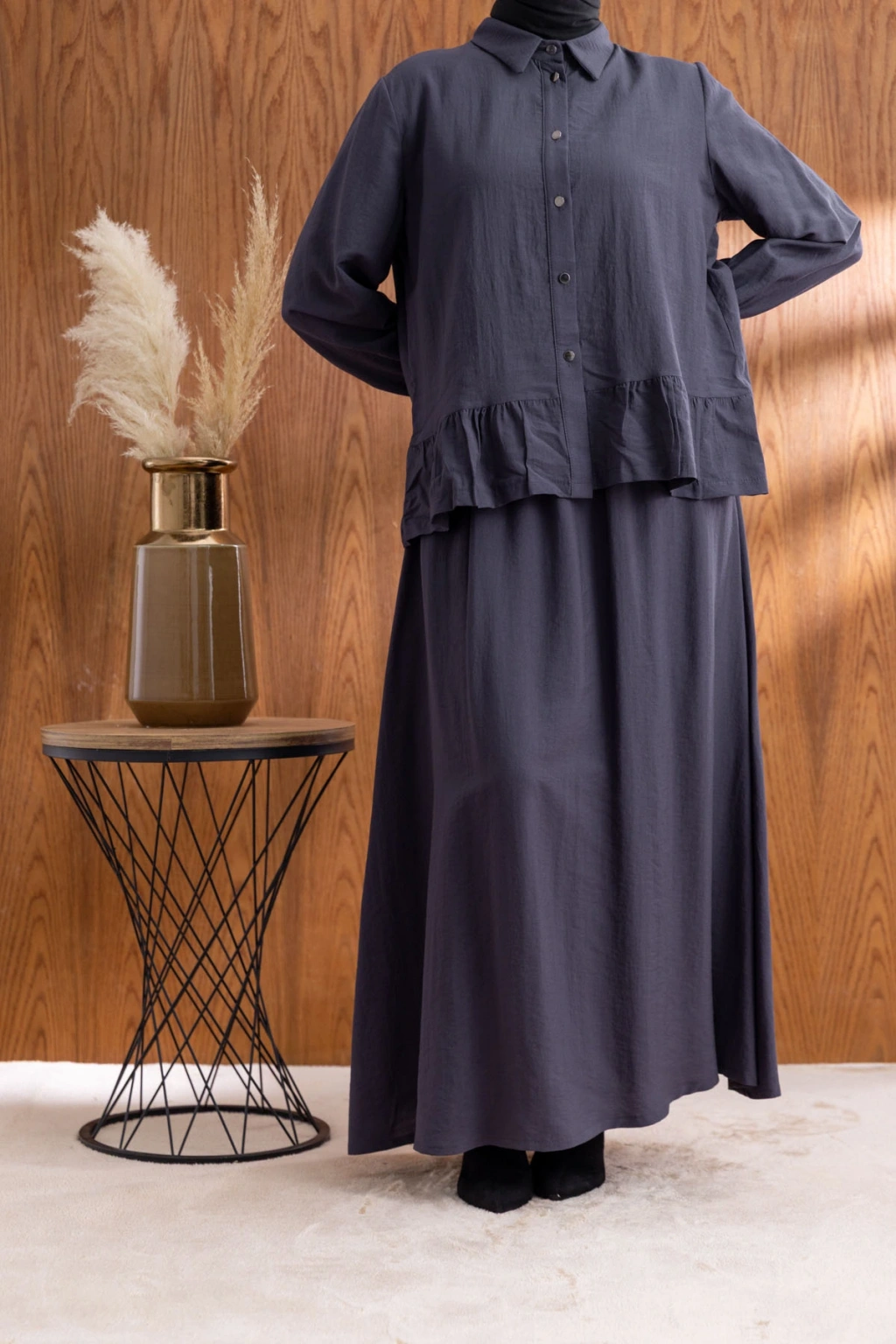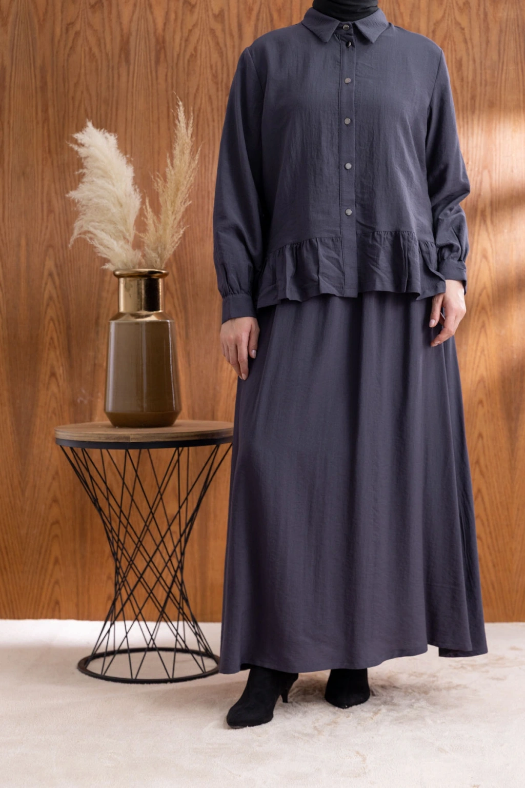 FIRFIR DETAYLI GÖMLEK YAKA ETEKLİ TAKIM - ANTRASİT, şıklığı ve rahatlığı bir araya getiren benzersiz bir tasarımdır. Yüksek kaliteli kumaşı ve zarif detayları ile hem günlük kullanıma hem de özel günlere uygun olarak tasarlanmıştır.
