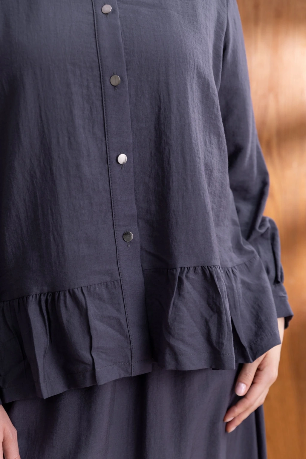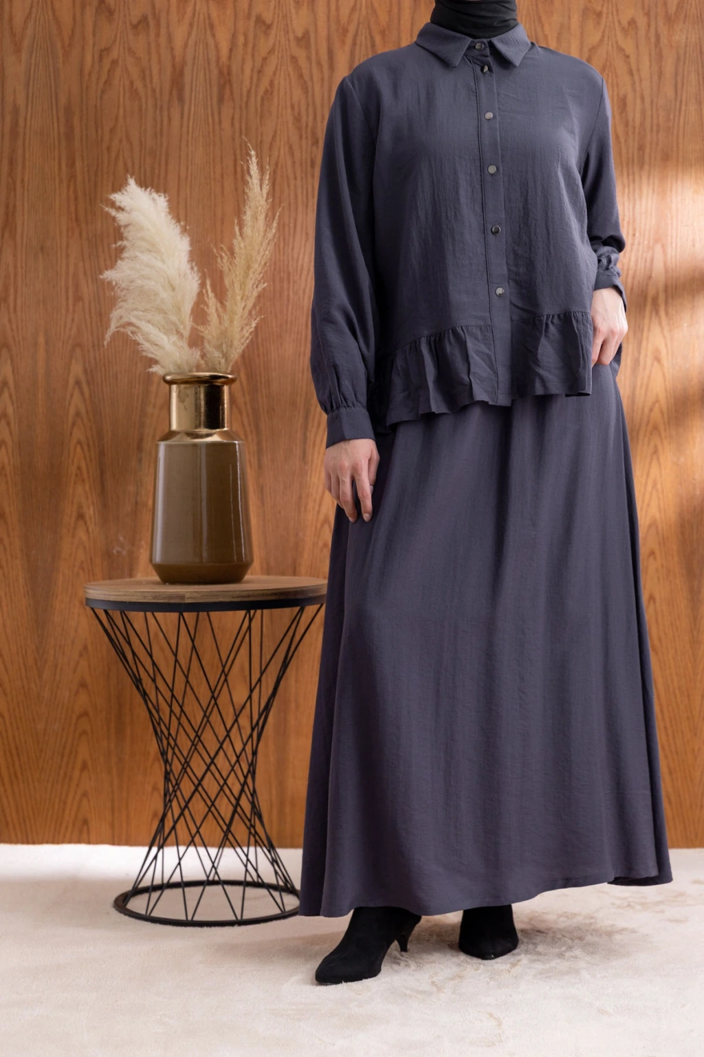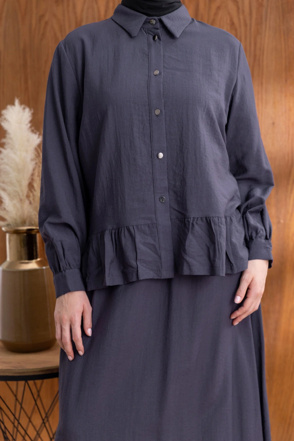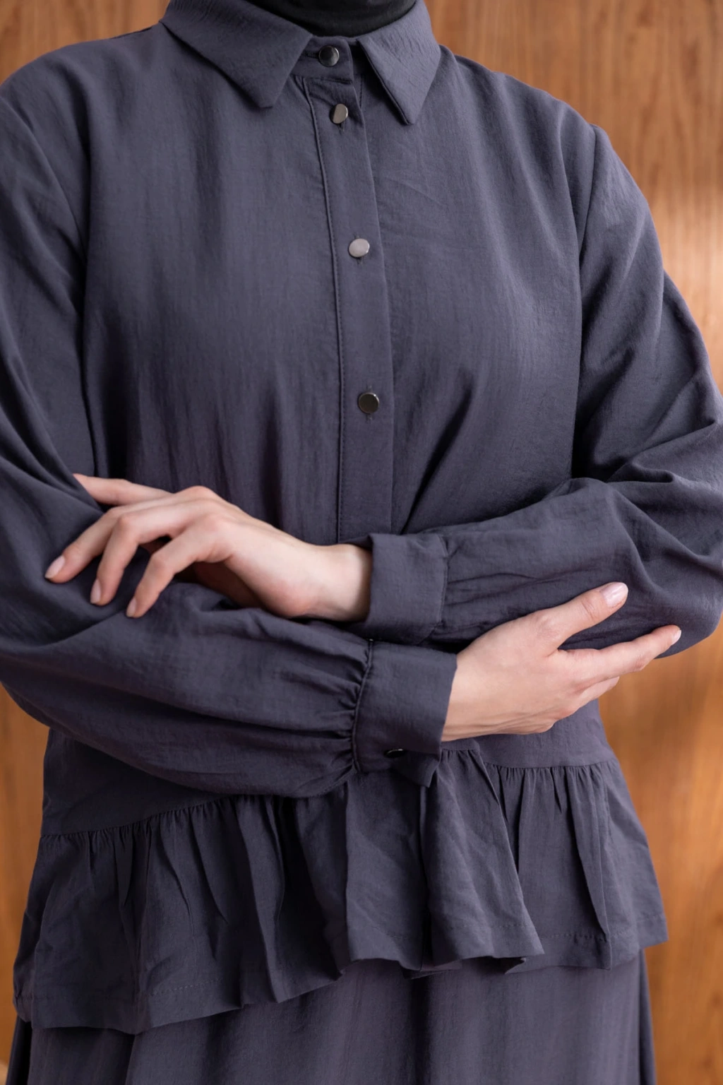 Ürün Adı: FIRFIR DETAYLI GÖMLEK YAKA ETEKLİ TAKIM - ANTRASİT