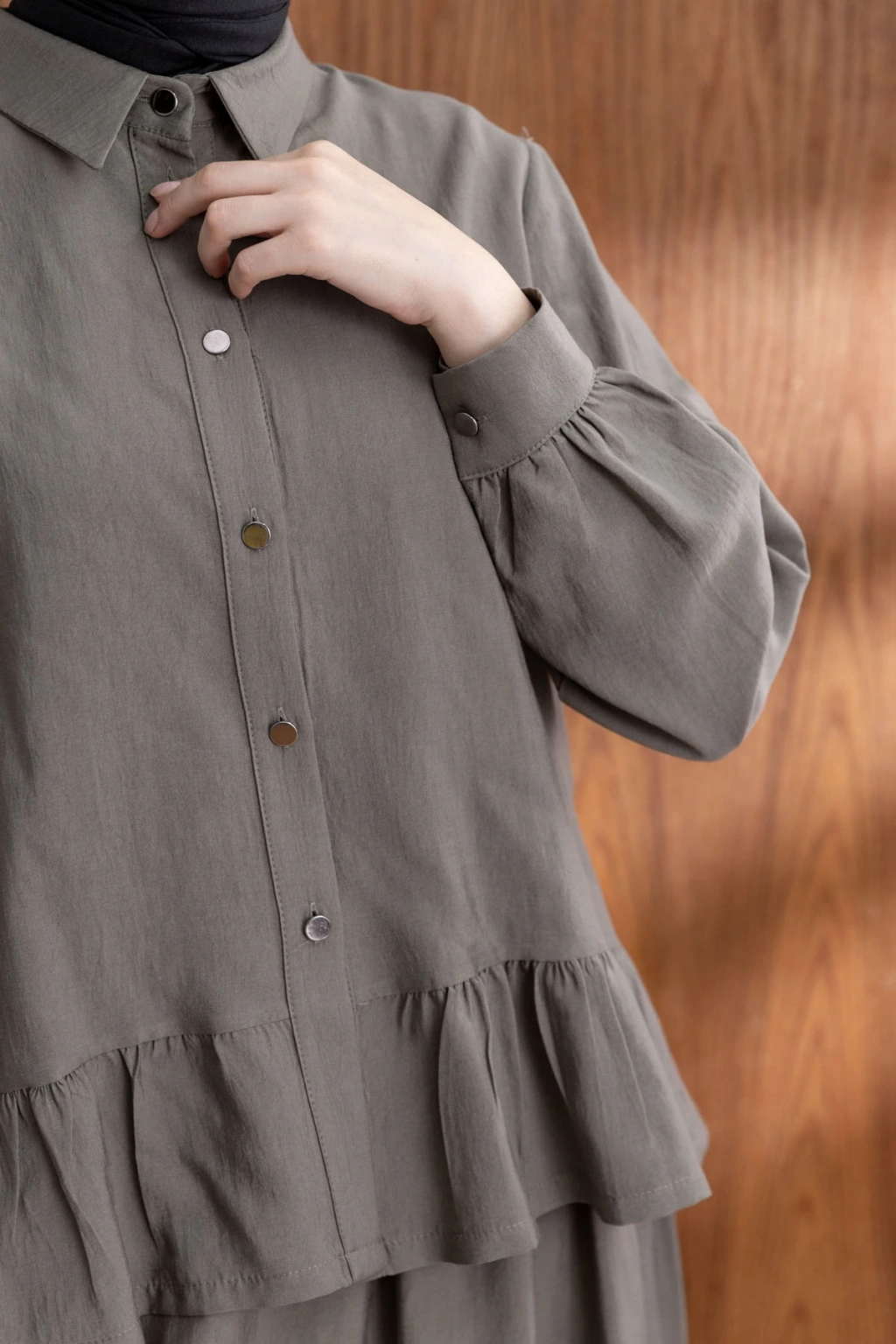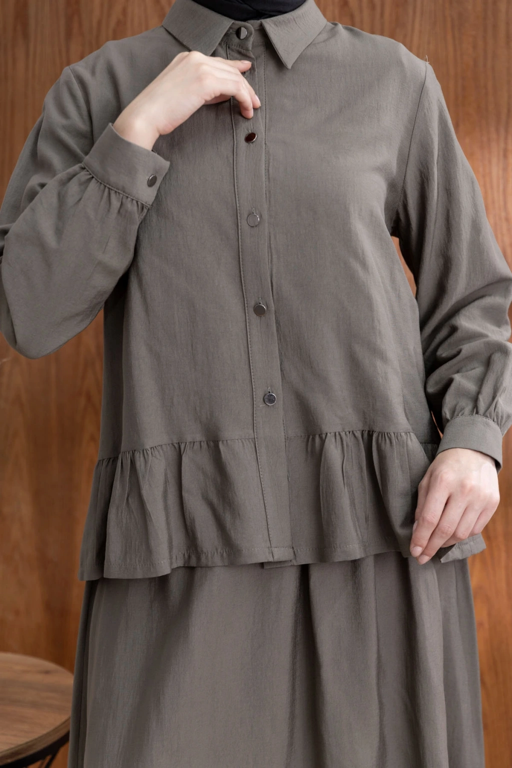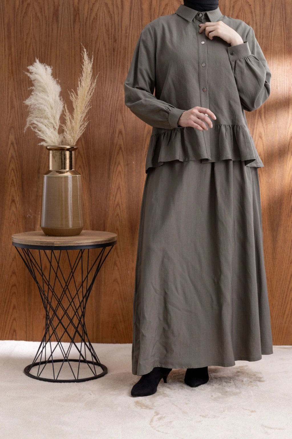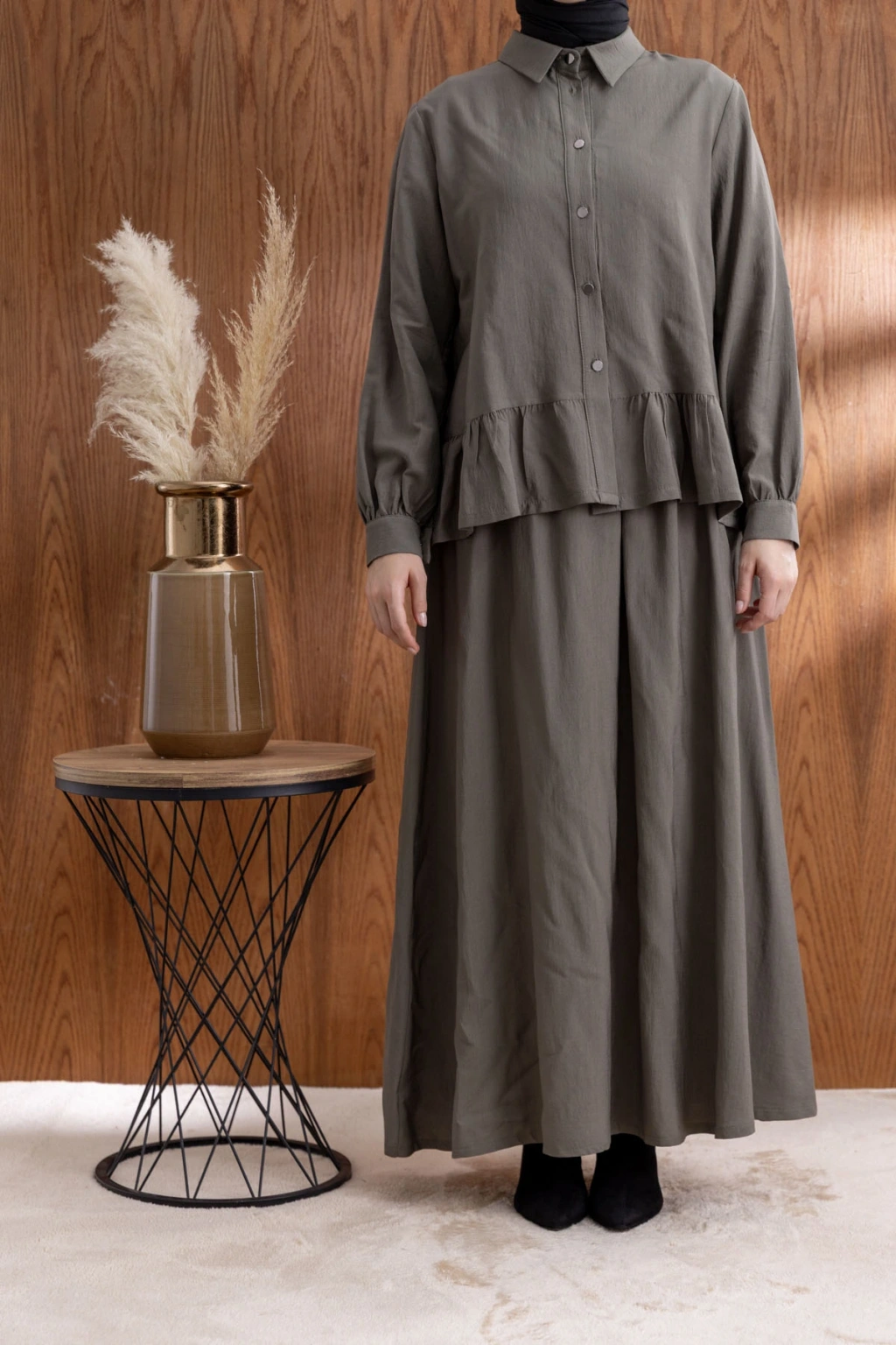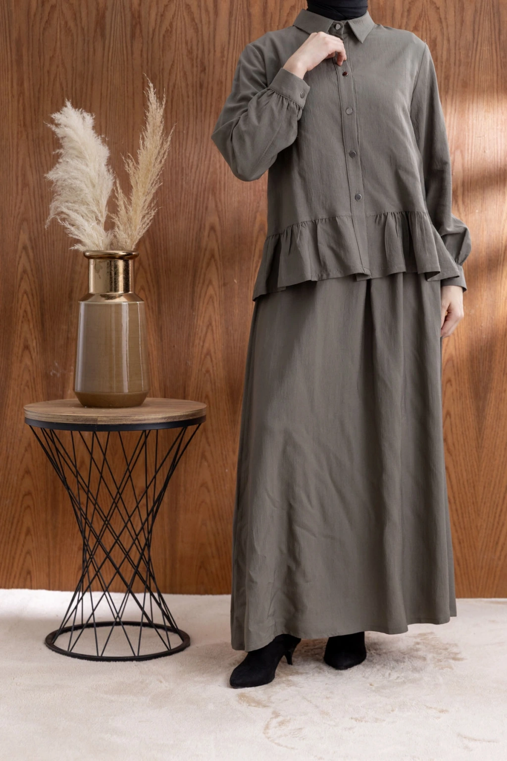 FIRFIR DETAYLI GÖMLEK YAKA ETEKLİ TAKIM - HAKİ ile tarzınızı yansıtın ve her ortamda fark yaratın. Şimdi LETAFET kalitesiyle sahip olun ve gardırobunuza yenilik katın!