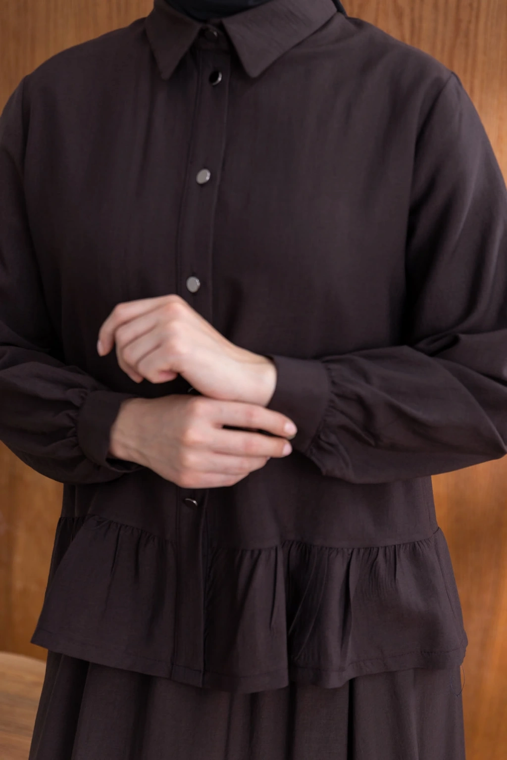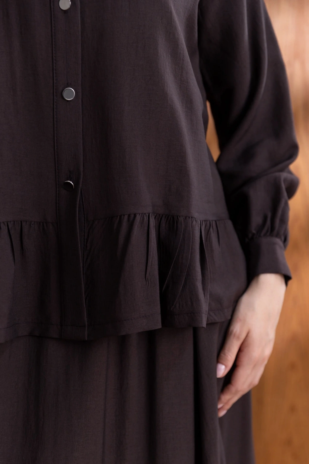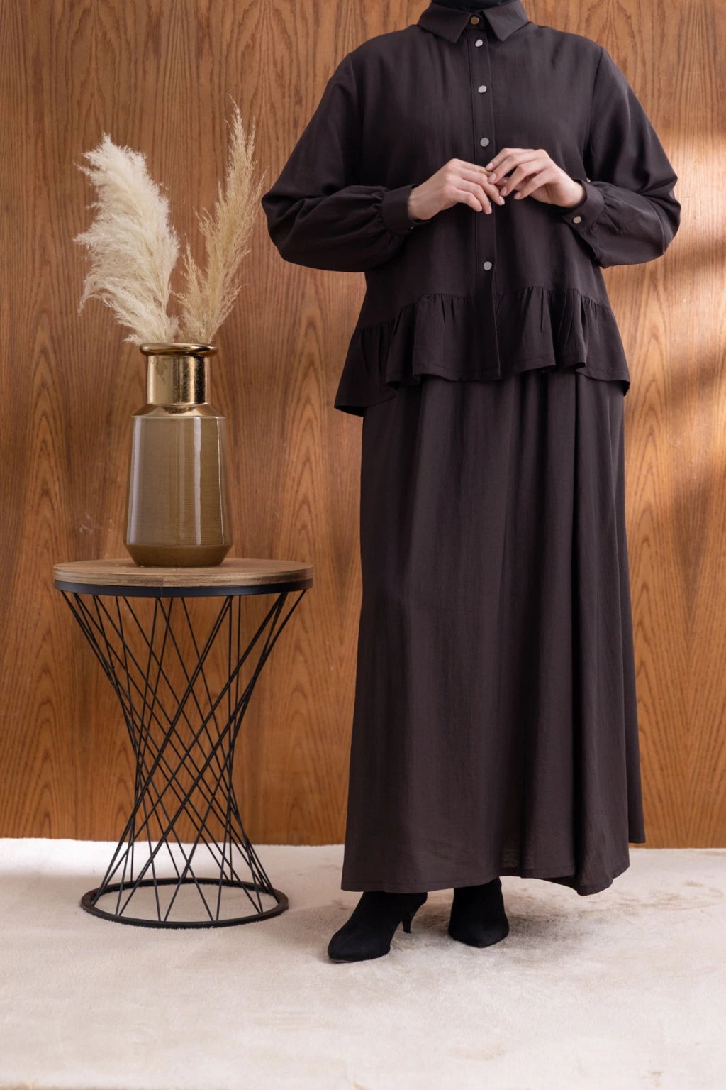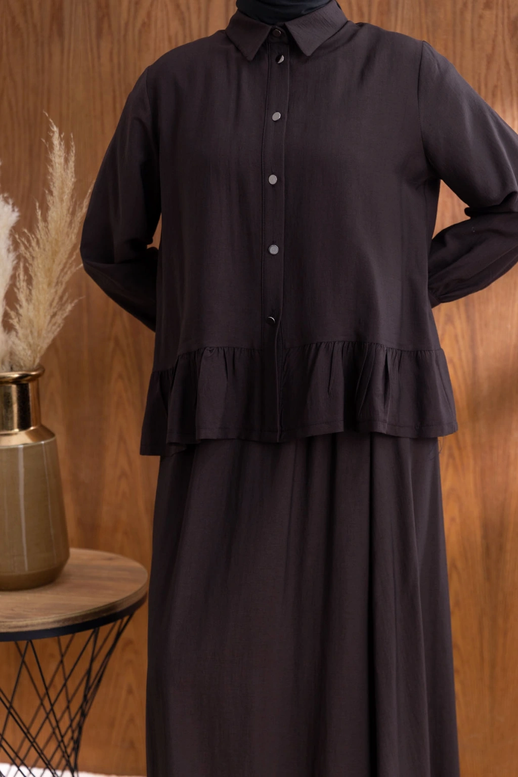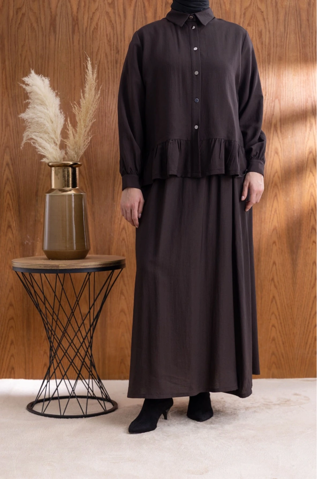 Ürün Adı: FIRFIR DETAYLI GÖMLEK YAKA ETEKLİ TAKIM - KAHVE