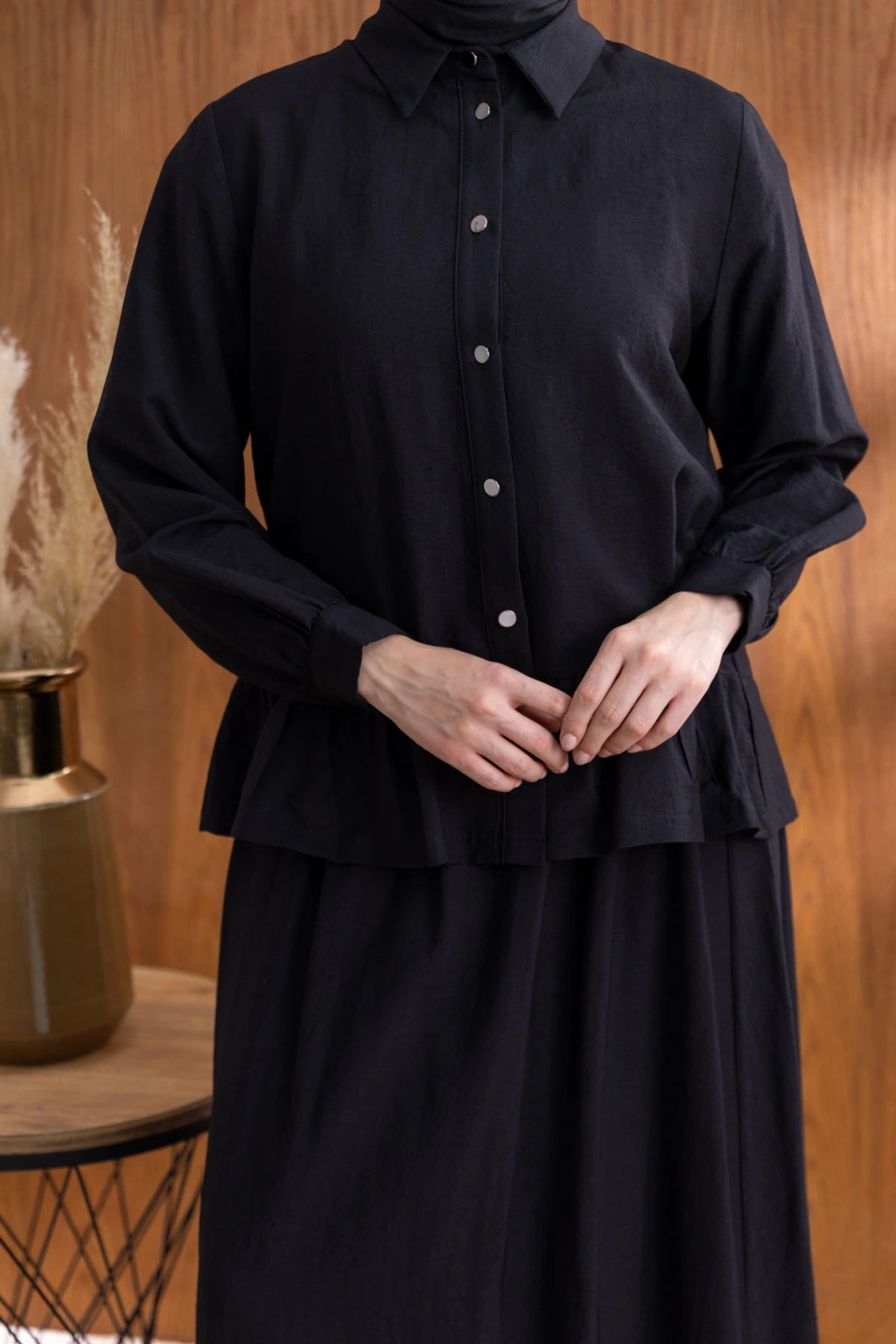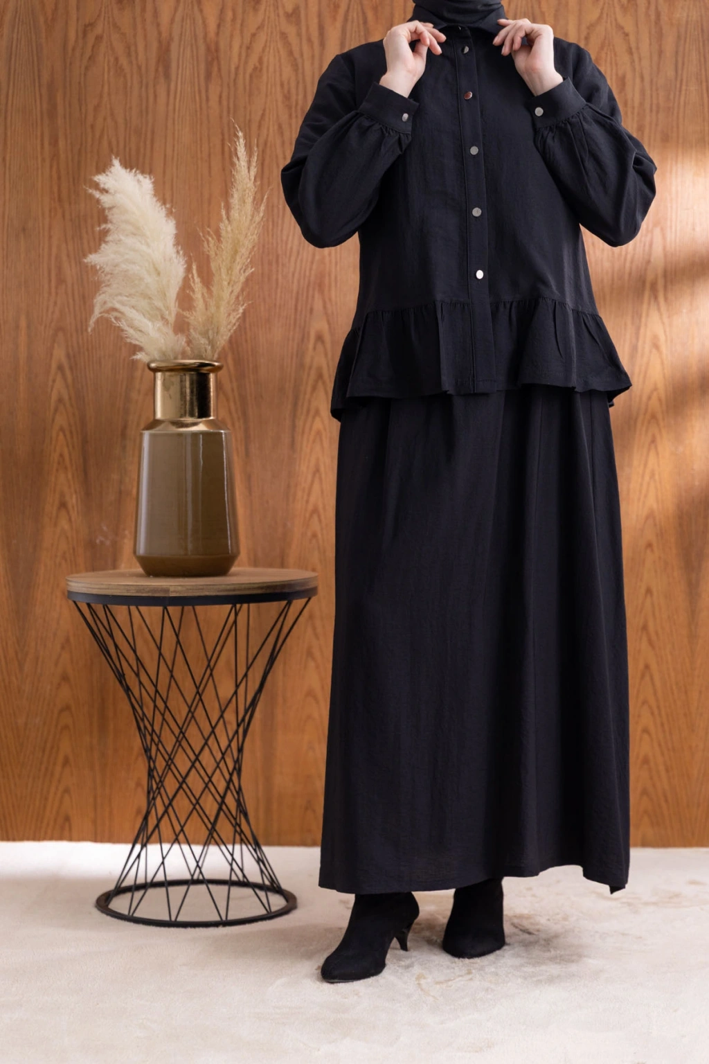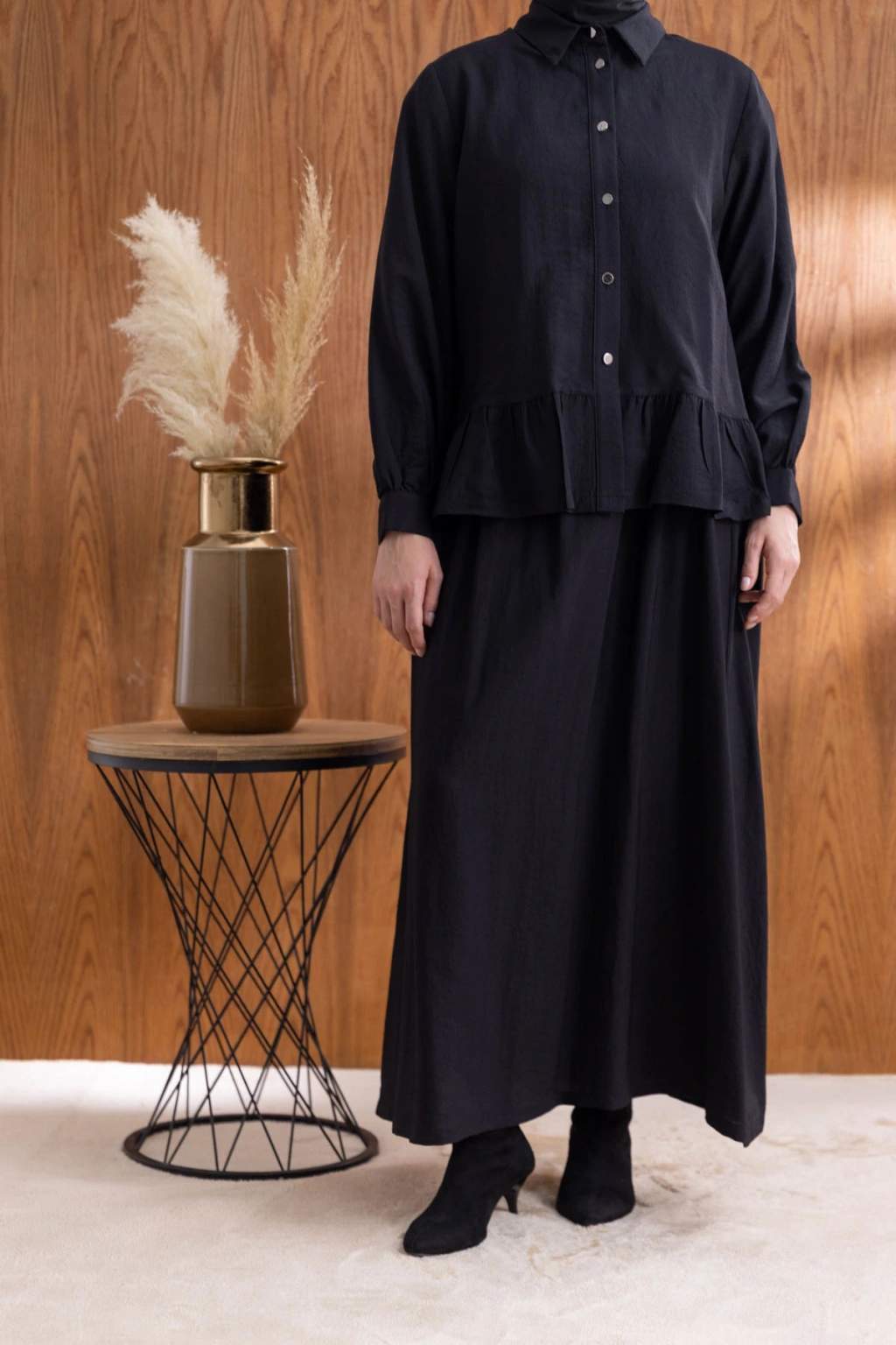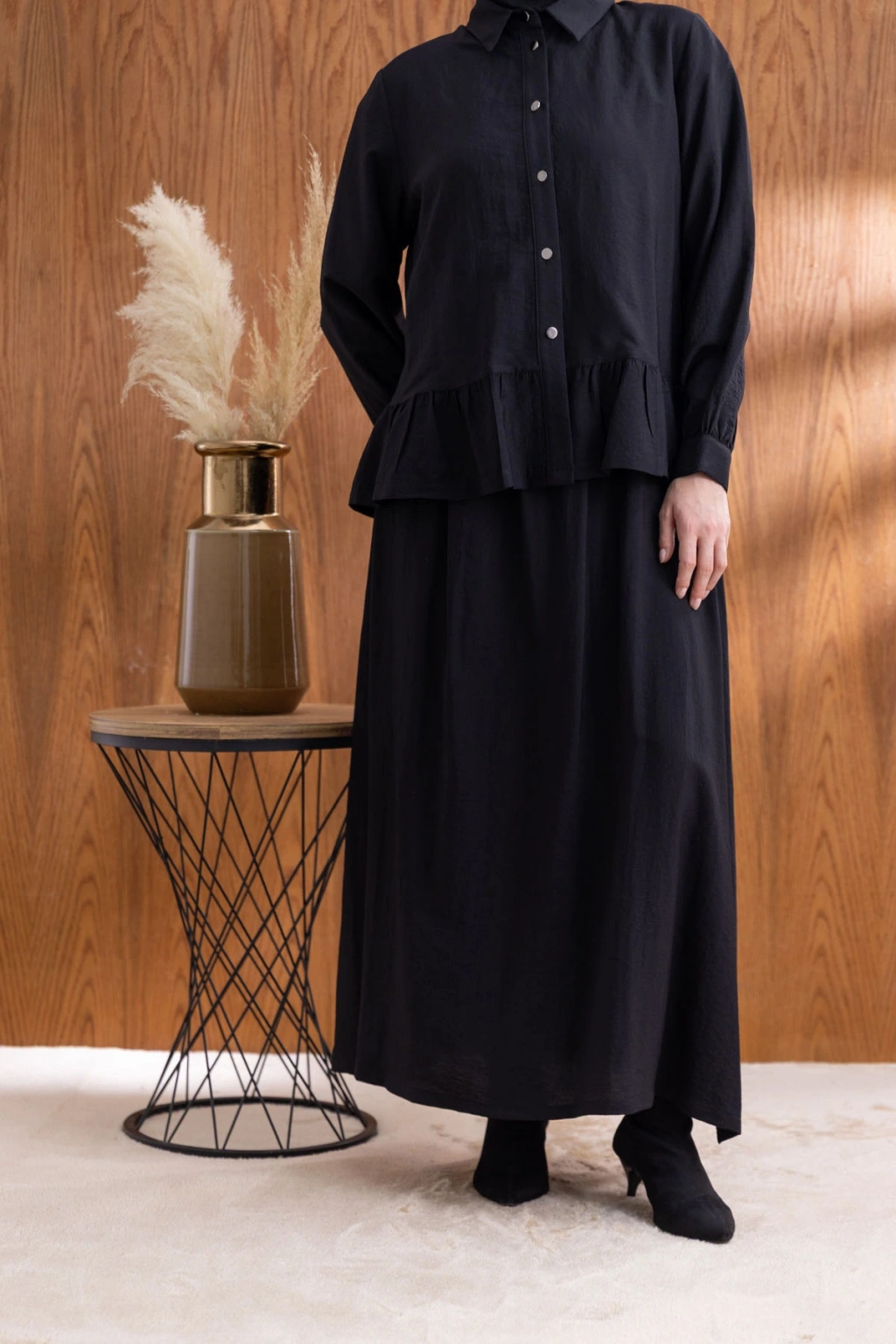 FIRFIR DETAYLI GÖMLEK YAKA ETEKLİ TAKIM - SİYAH, şıklığı ve rahatlığı bir araya getiren benzersiz bir tasarımdır. Yüksek kaliteli kumaşı ve zarif detayları ile hem günlük kullanıma hem de özel günlere uygun olarak tasarlanmıştır.
