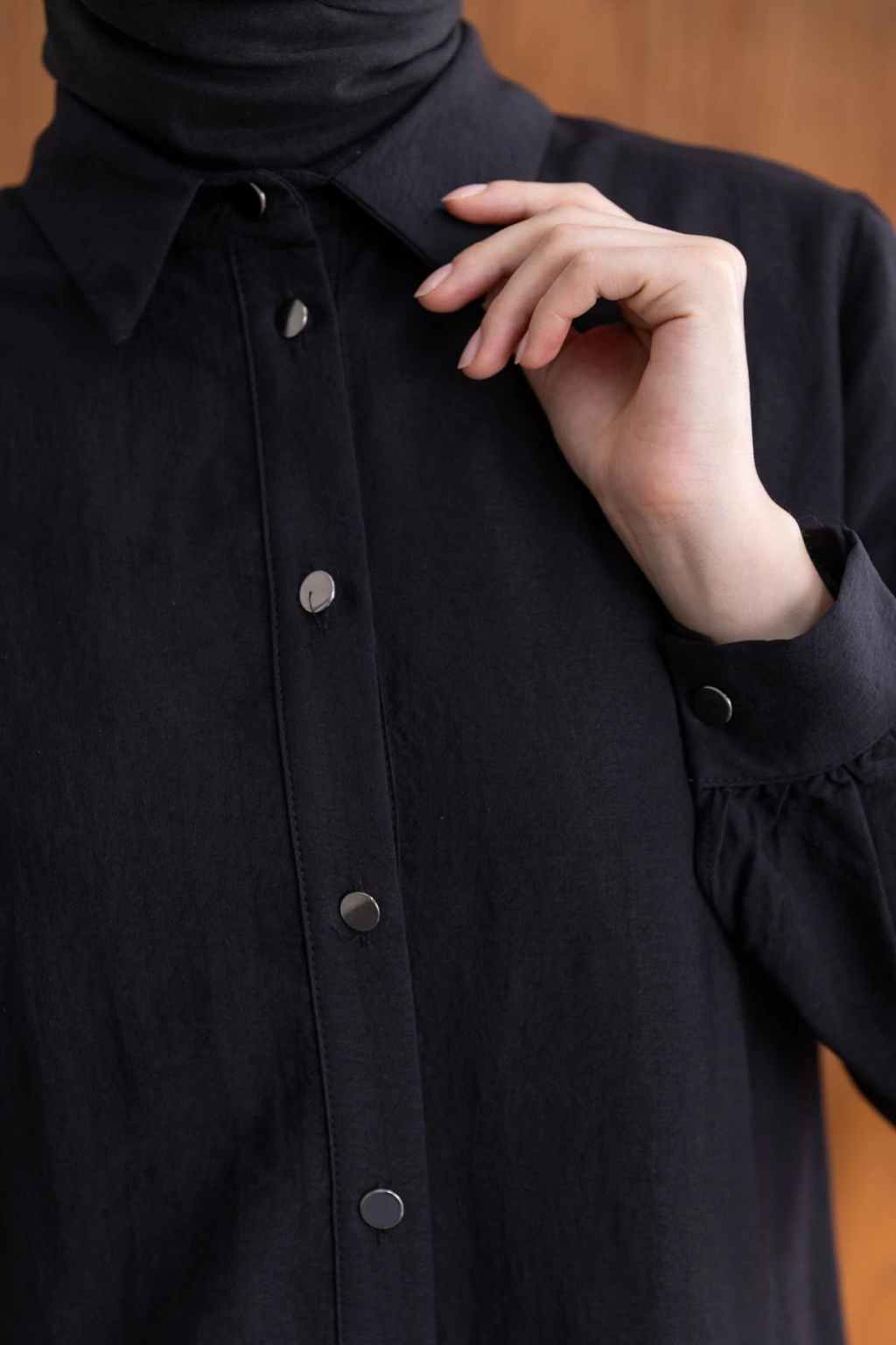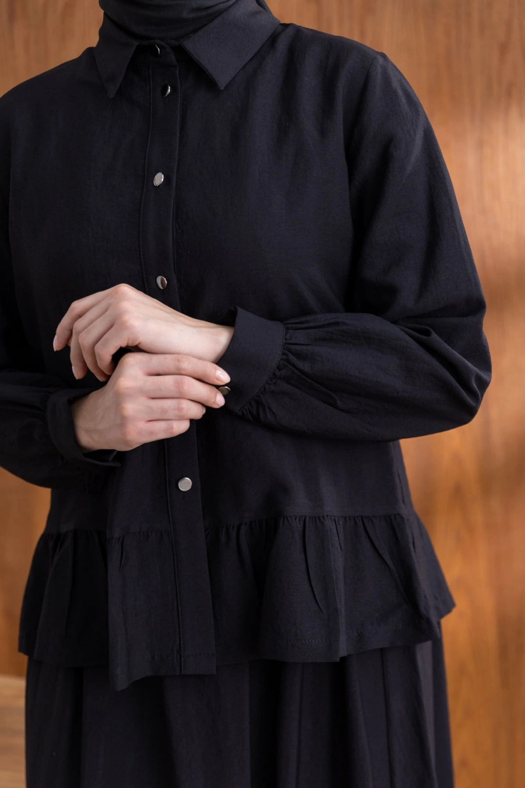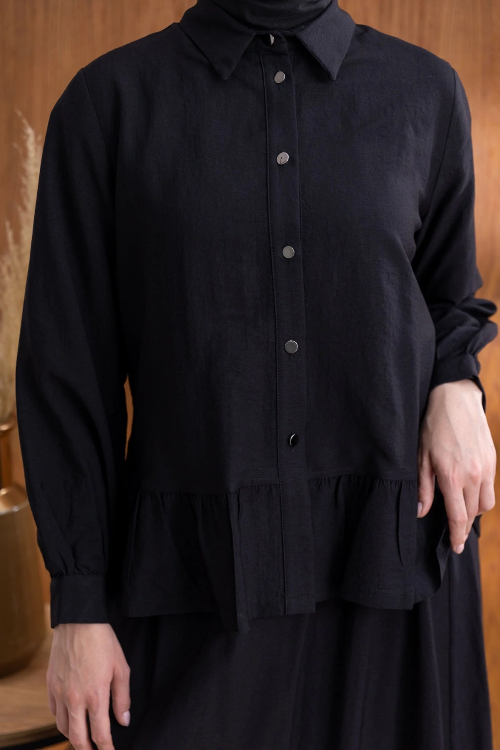 Ürün Adı: FIRFIR DETAYLI GÖMLEK YAKA ETEKLİ TAKIM - SİYAH