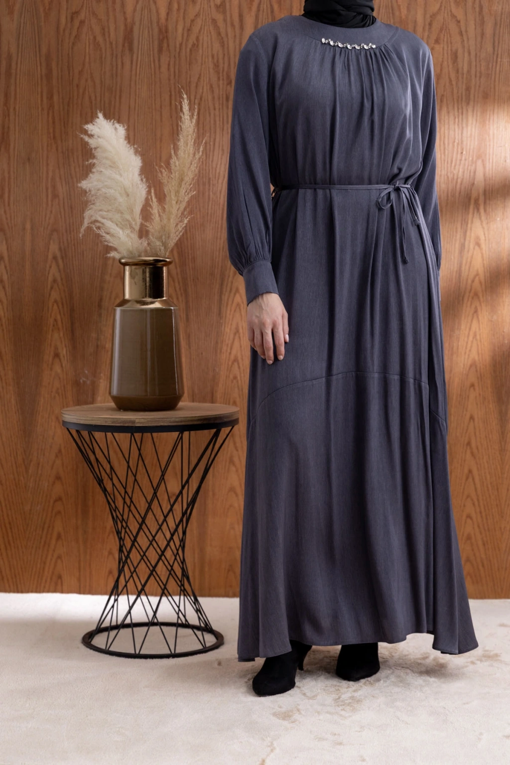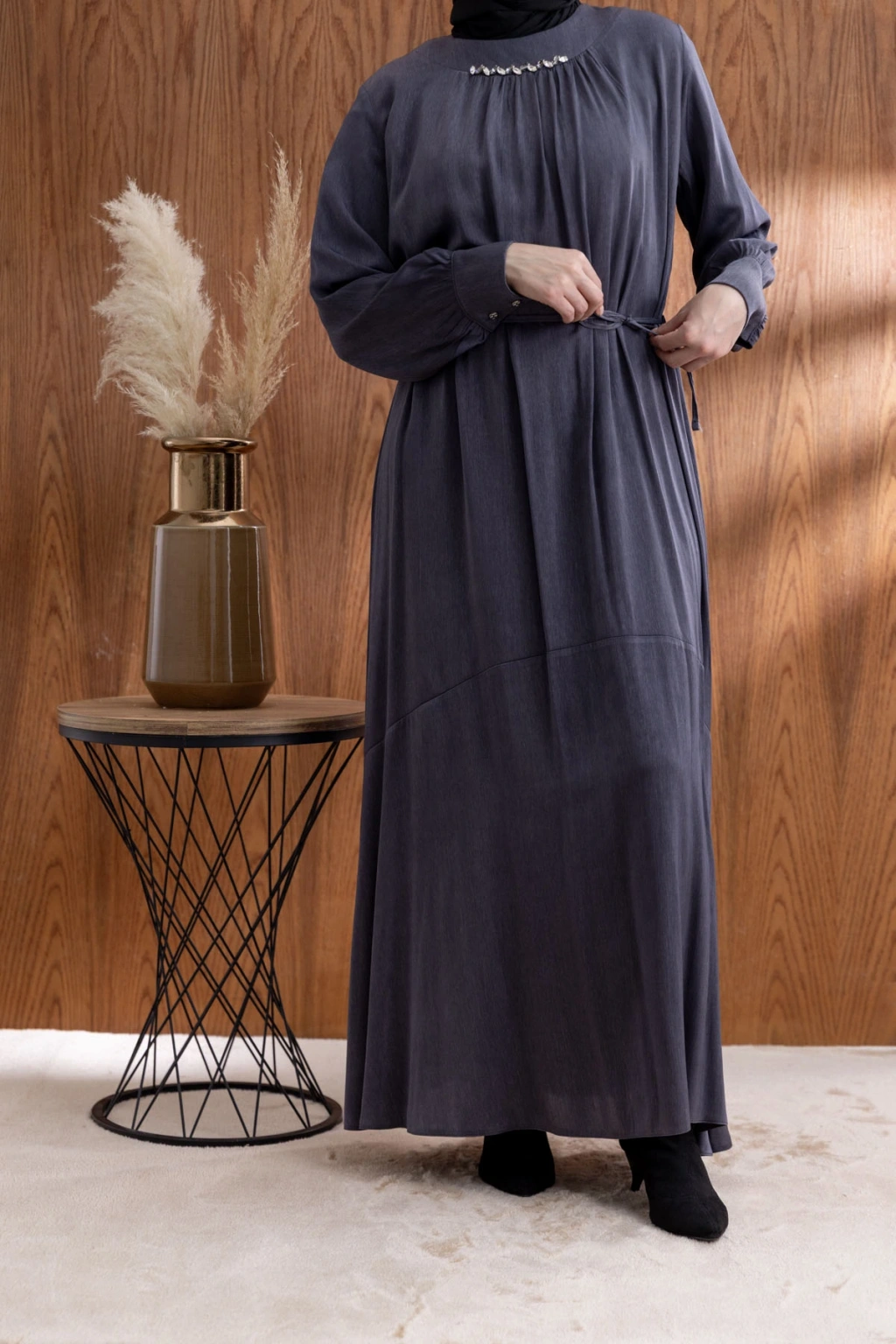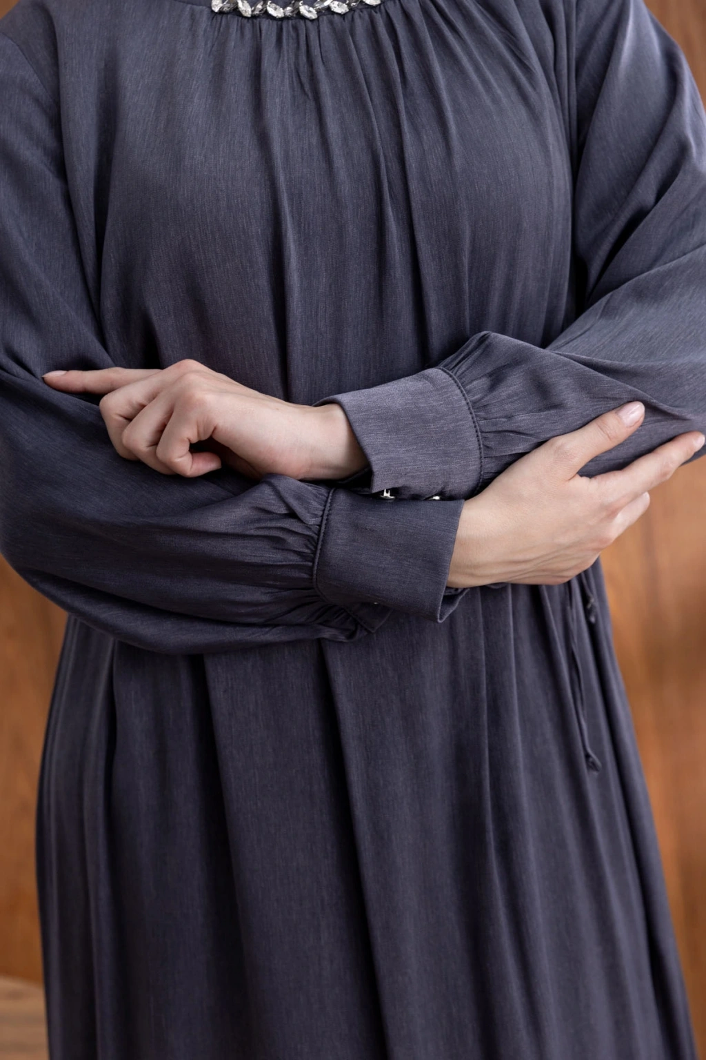 YAKASI BÜZGÜ VE TAŞ DETAYLI ELBİSE - GRİ ile tarzınızı yansıtın ve her ortamda fark yaratın. Şimdi LETAFET kalitesiyle sahip olun ve gardırobunuza yenilik katın!