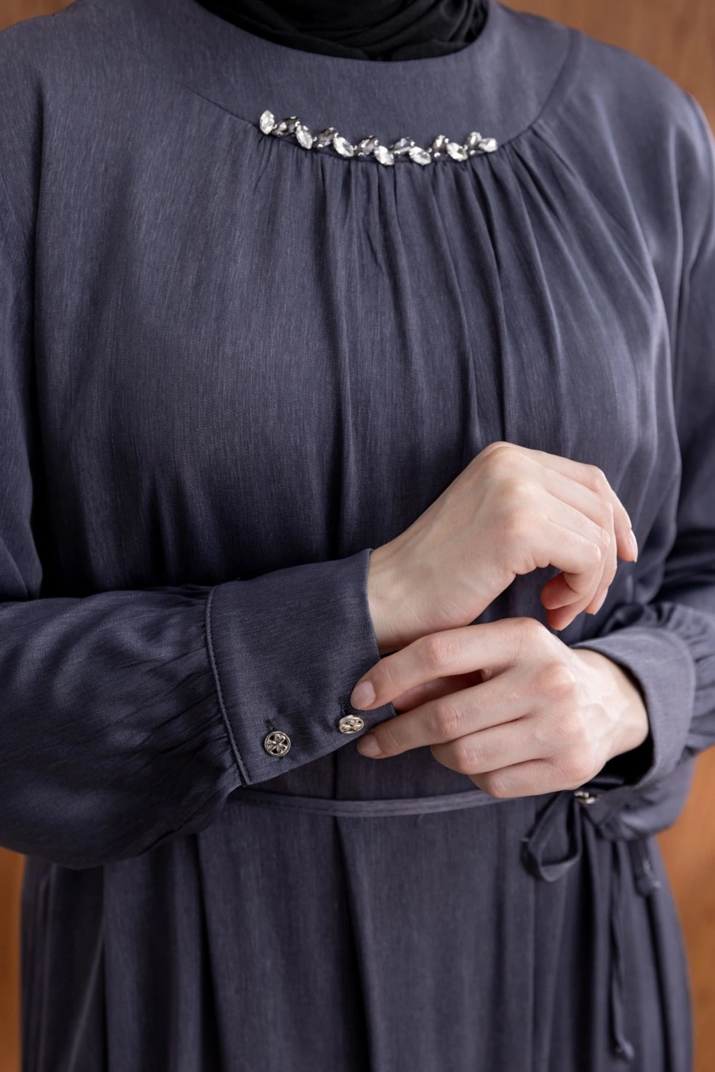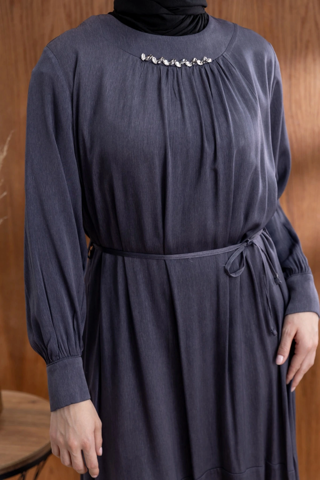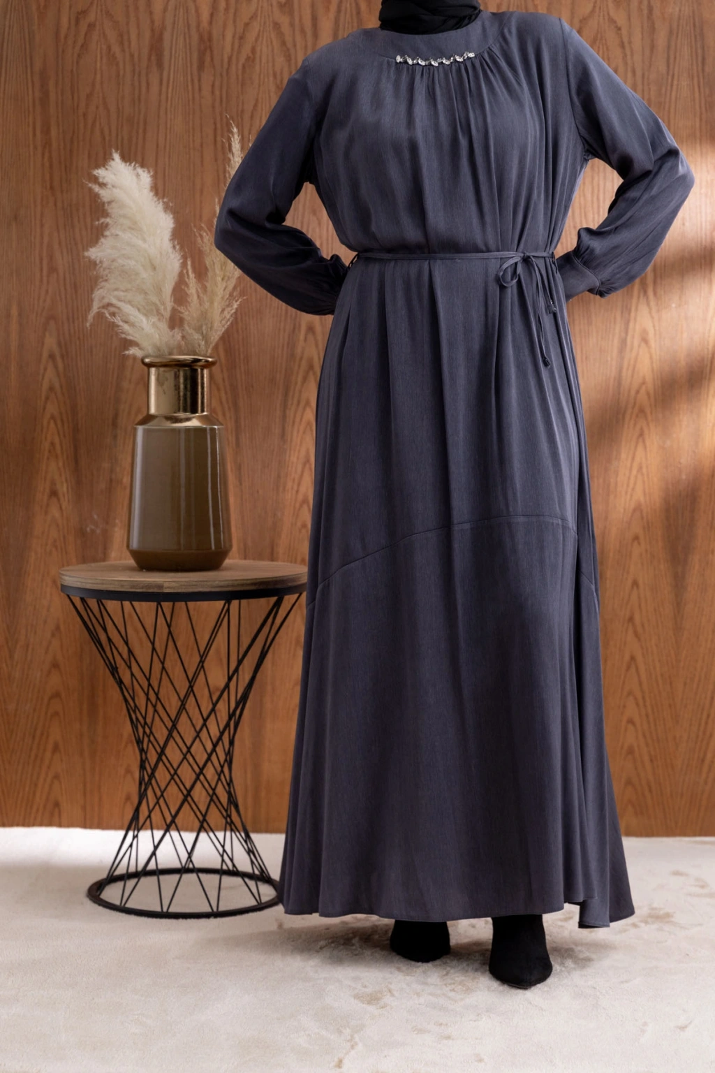 YAKASI BÜZGÜ VE TAŞ DETAYLI ELBİSE - GRİ ile tarzınızı yansıtın ve her ortamda fark yaratın. Şimdi LETAFET kalitesiyle sahip olun ve gardırobunuza yenilik katın!