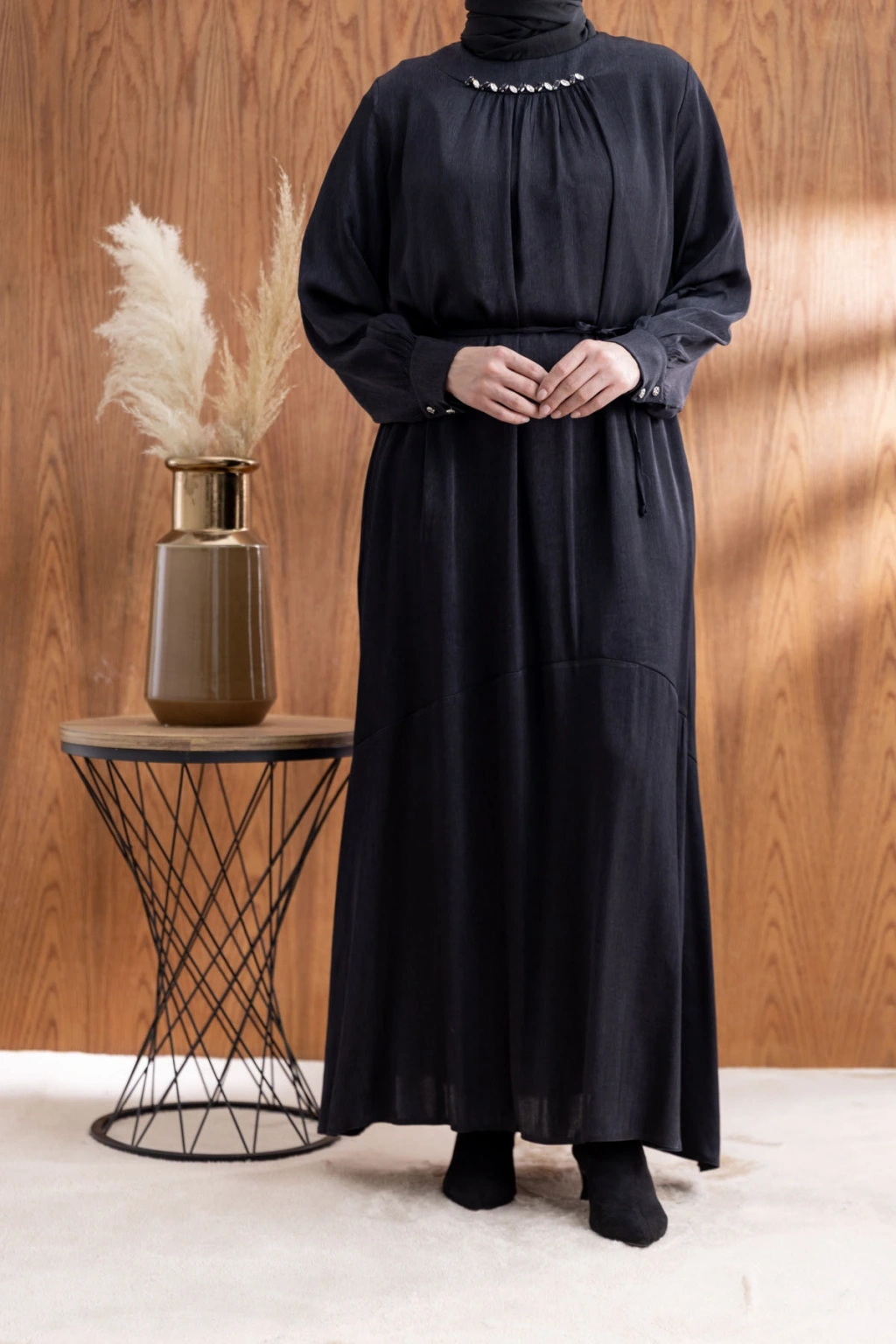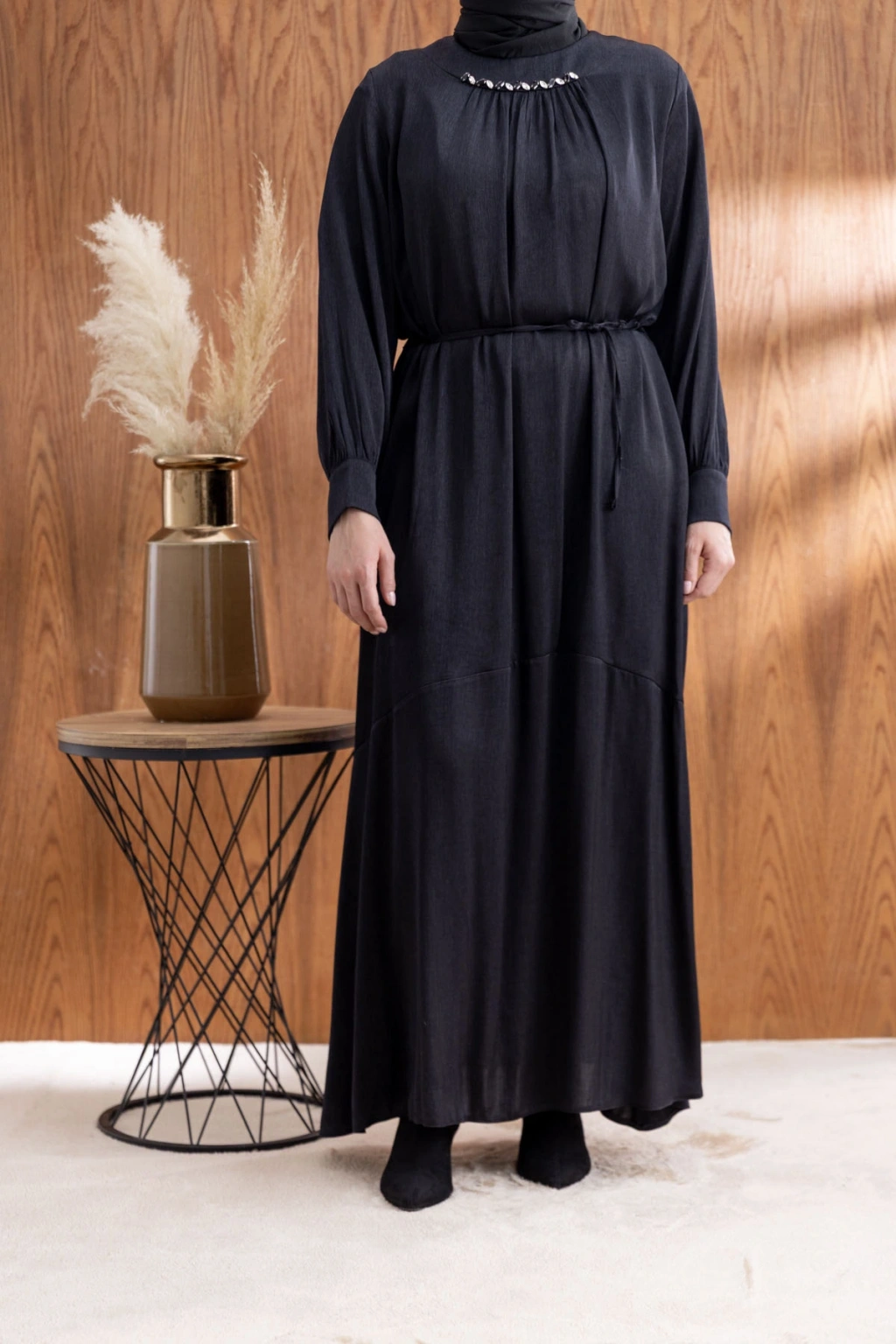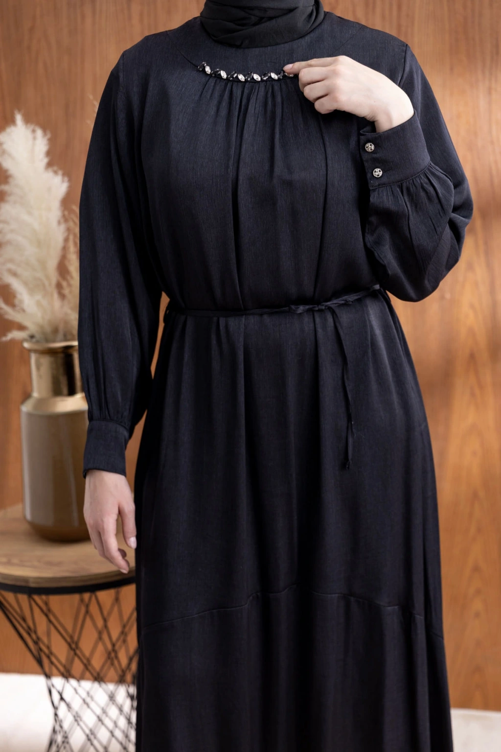 YAKASI BÜZGÜ VE TAŞ DETAYLI ELBİSE - SİYAH, şıklığı ve rahatlığı bir araya getiren benzersiz bir tasarımdır. Yüksek kaliteli kumaşı ve zarif detayları ile hem günlük kullanıma hem de özel günlere uygun olarak tasarlanmıştır.