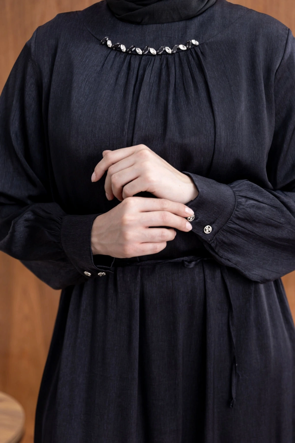 YAKASI BÜZGÜ VE TAŞ DETAYLI ELBİSE - SİYAH ile tarzınızı yansıtın ve her ortamda fark yaratın. Şimdi LETAFET kalitesiyle sahip olun ve gardırobunuza yenilik katın!