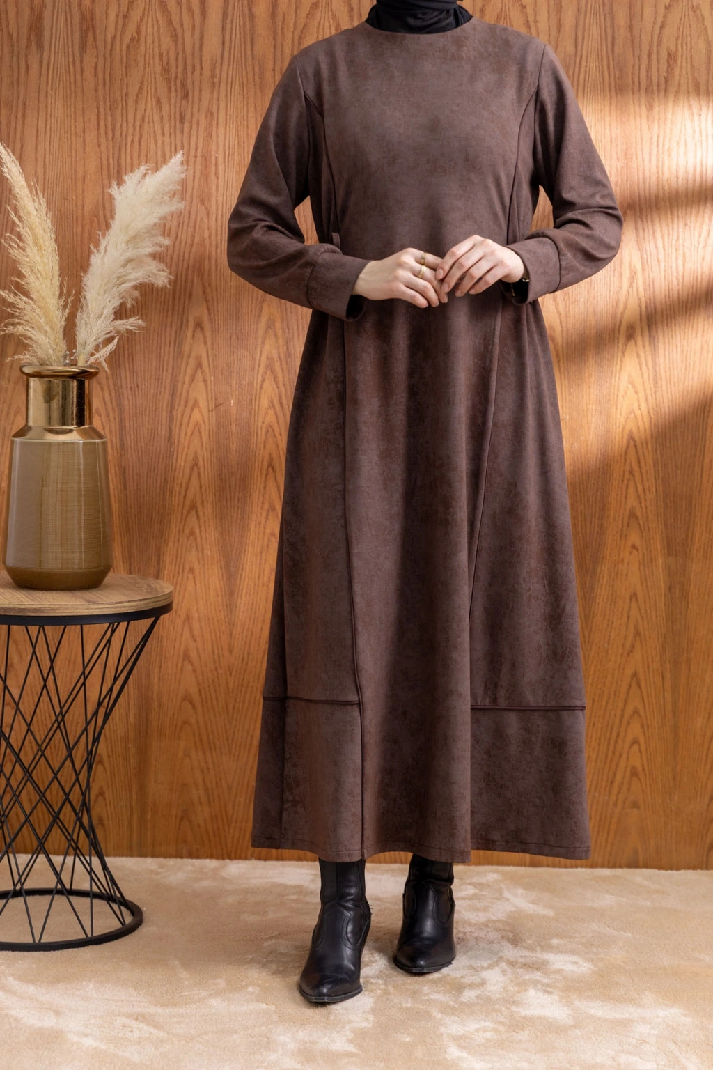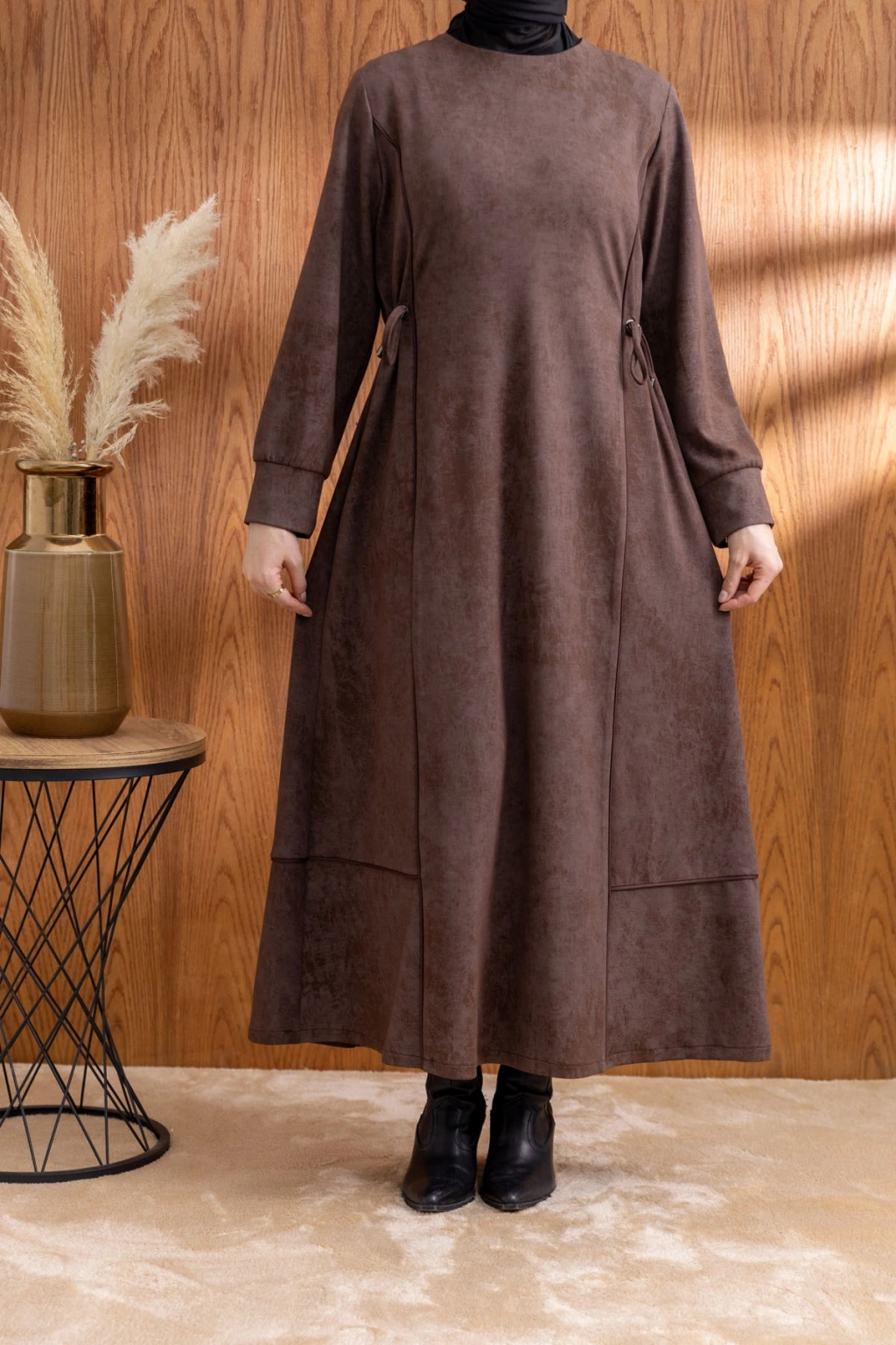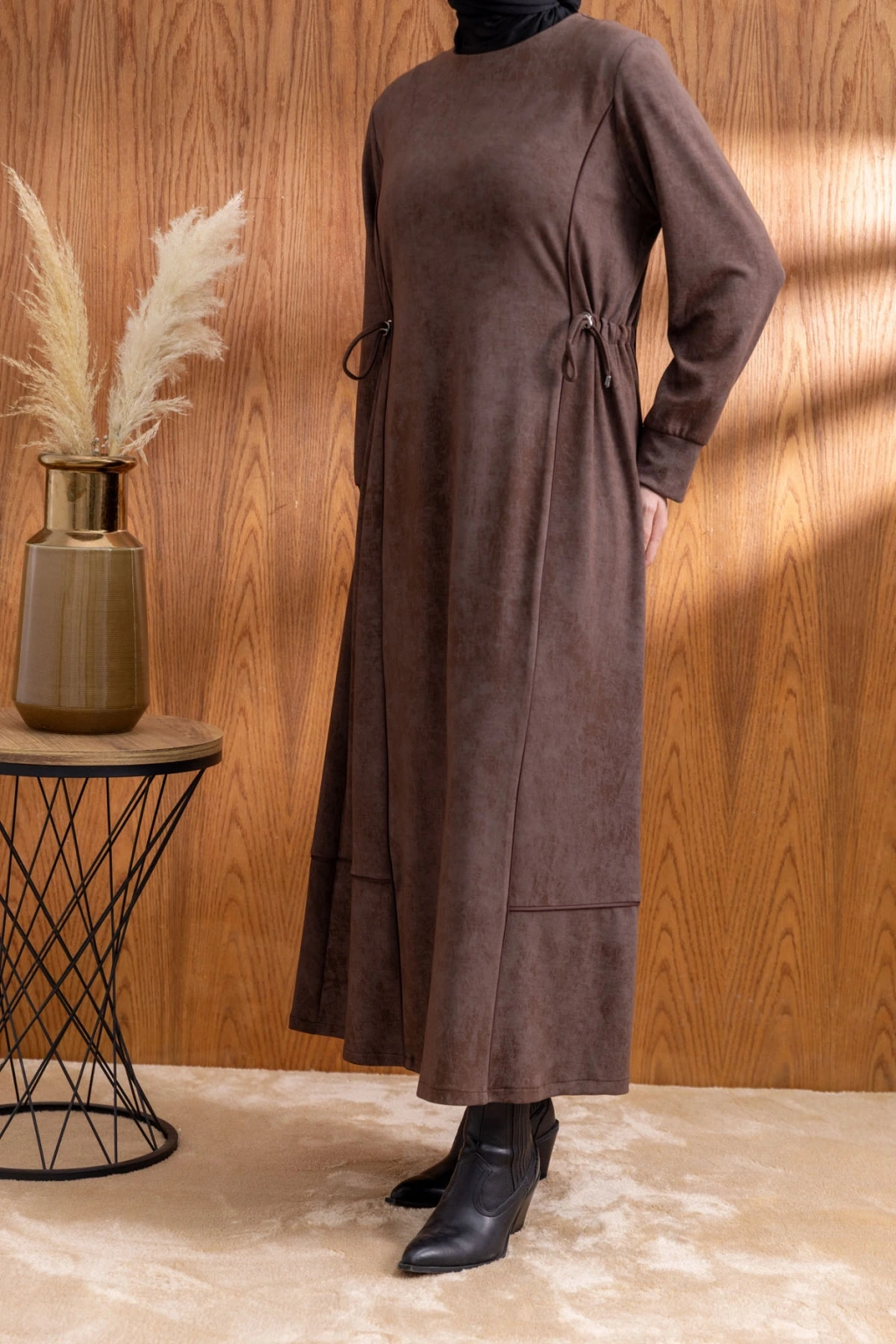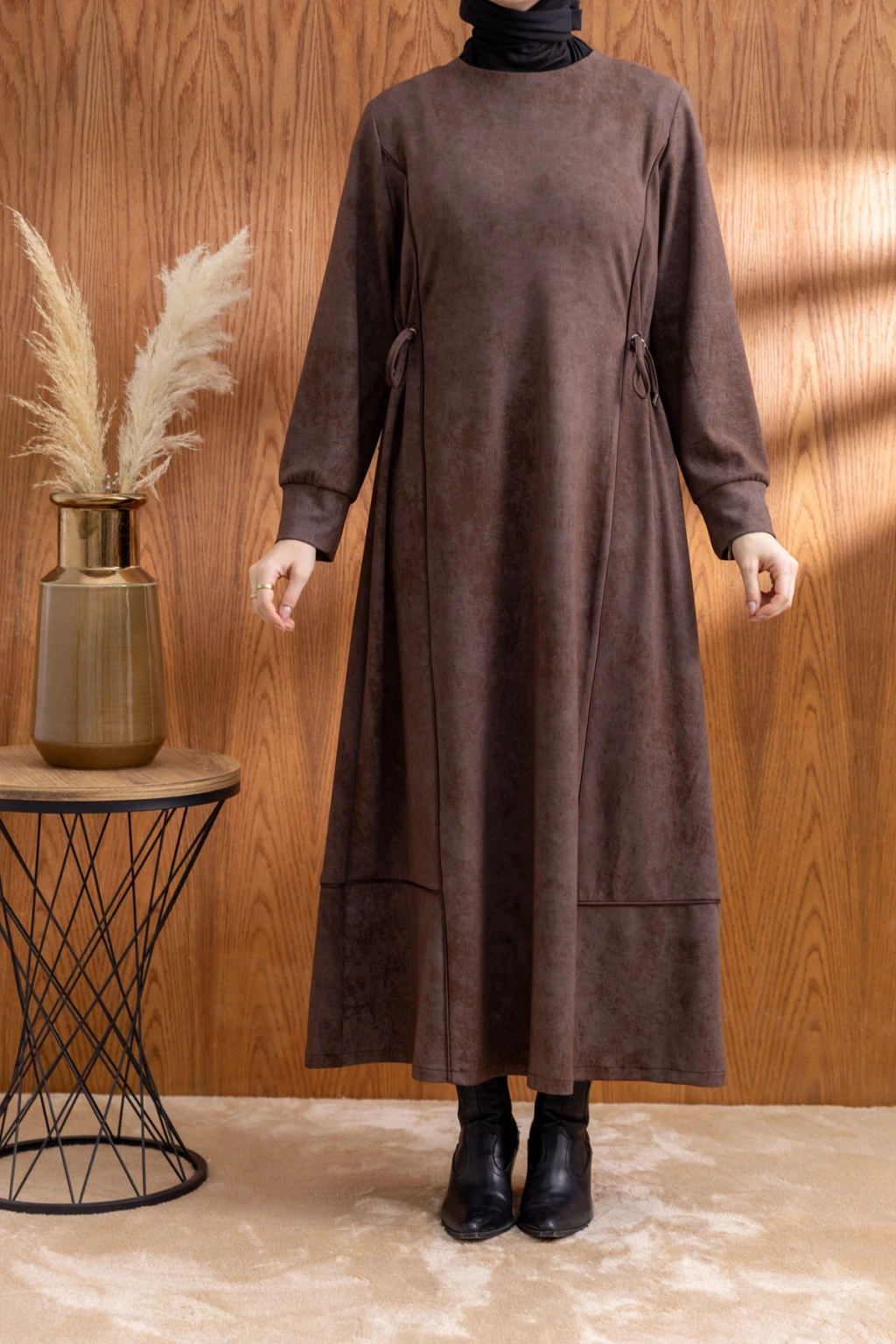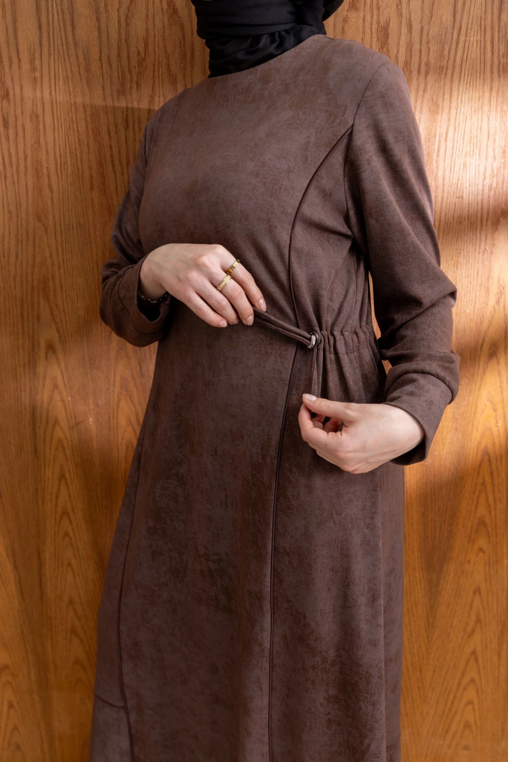 Ürün Adı: BELİ BAĞCIK DETAYLI KUPLU ELBİSE - KAHVE