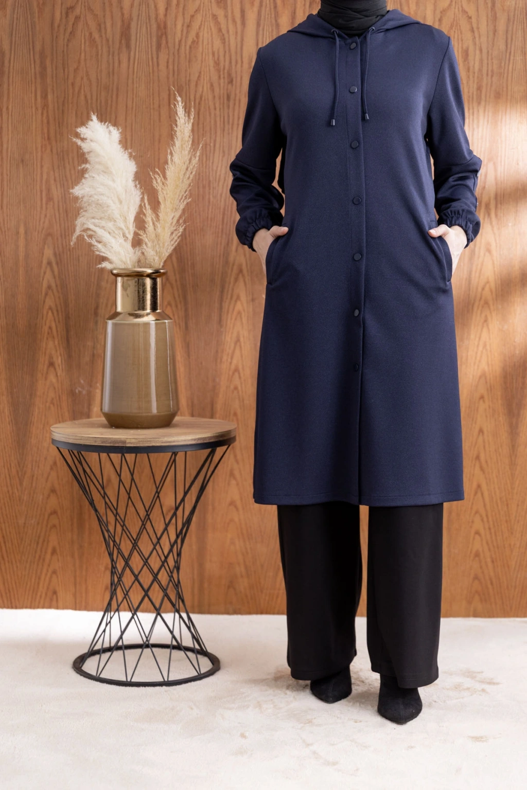 ÖNÜ ÇITÇITLI KAPÜŞONLU GİYÇIK - LACİVERT, şıklığı ve rahatlığı bir araya getiren benzersiz bir tasarımdır. Yüksek kaliteli kumaşı ve zarif detayları ile hem günlük kullanıma hem de özel günlere uygun olarak tasarlanmıştır.