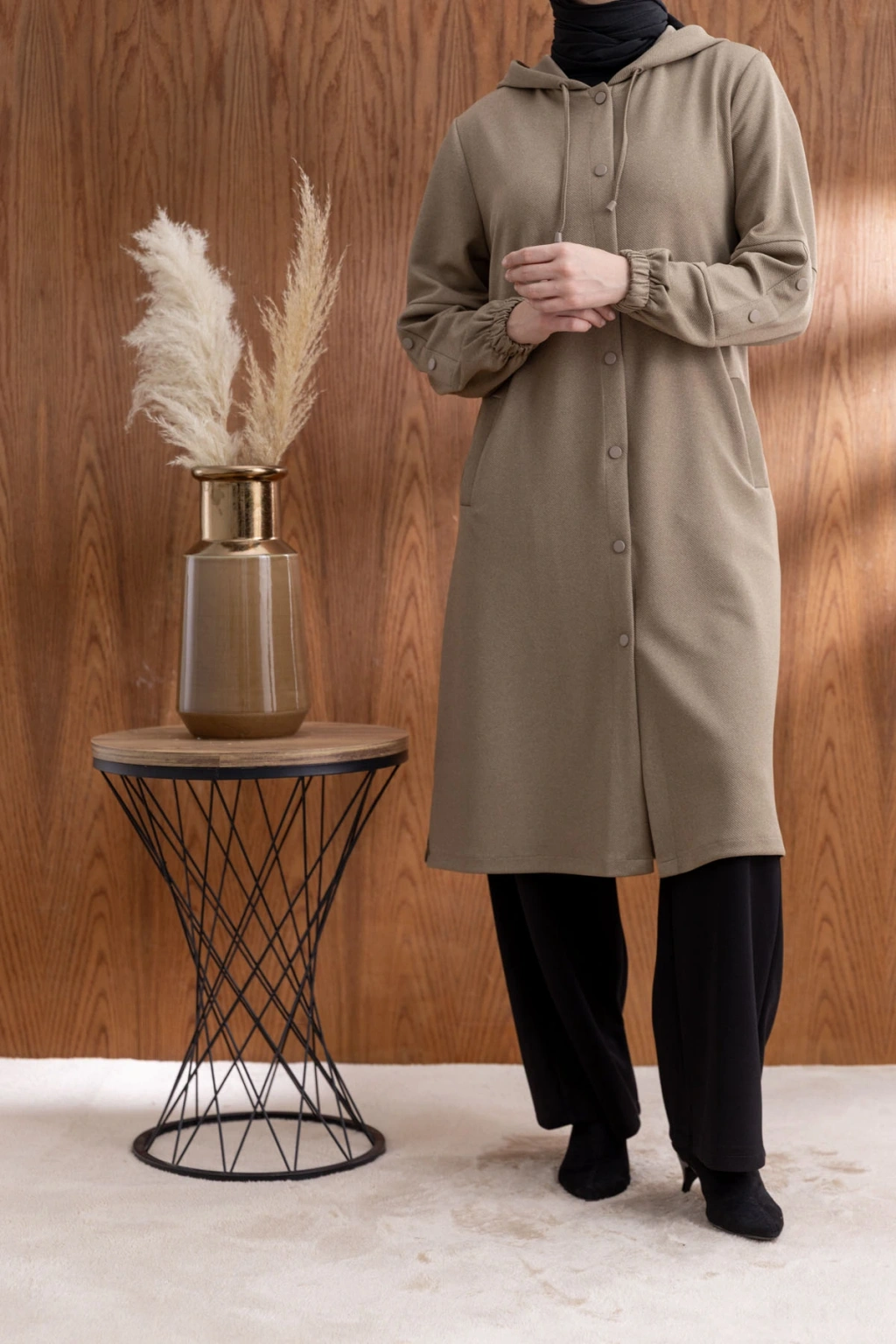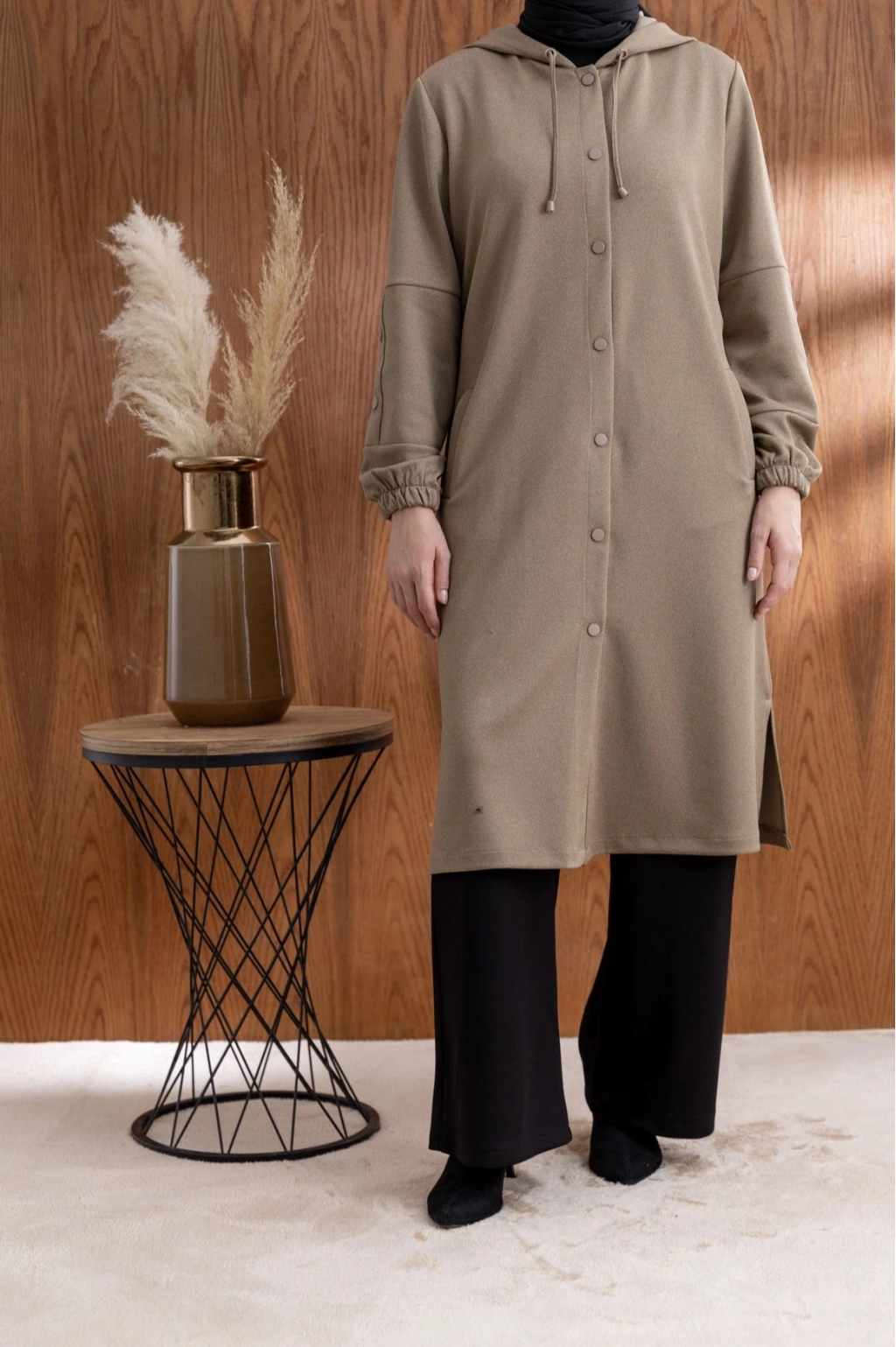 ÖNÜ ÇITÇITLI KAPÜŞONLU GİYÇIK - VİZON, şıklığı ve rahatlığı bir araya getiren benzersiz bir tasarımdır. Yüksek kaliteli kumaşı ve zarif detayları ile hem günlük kullanıma hem de özel günlere uygun olarak tasarlanmıştır.
