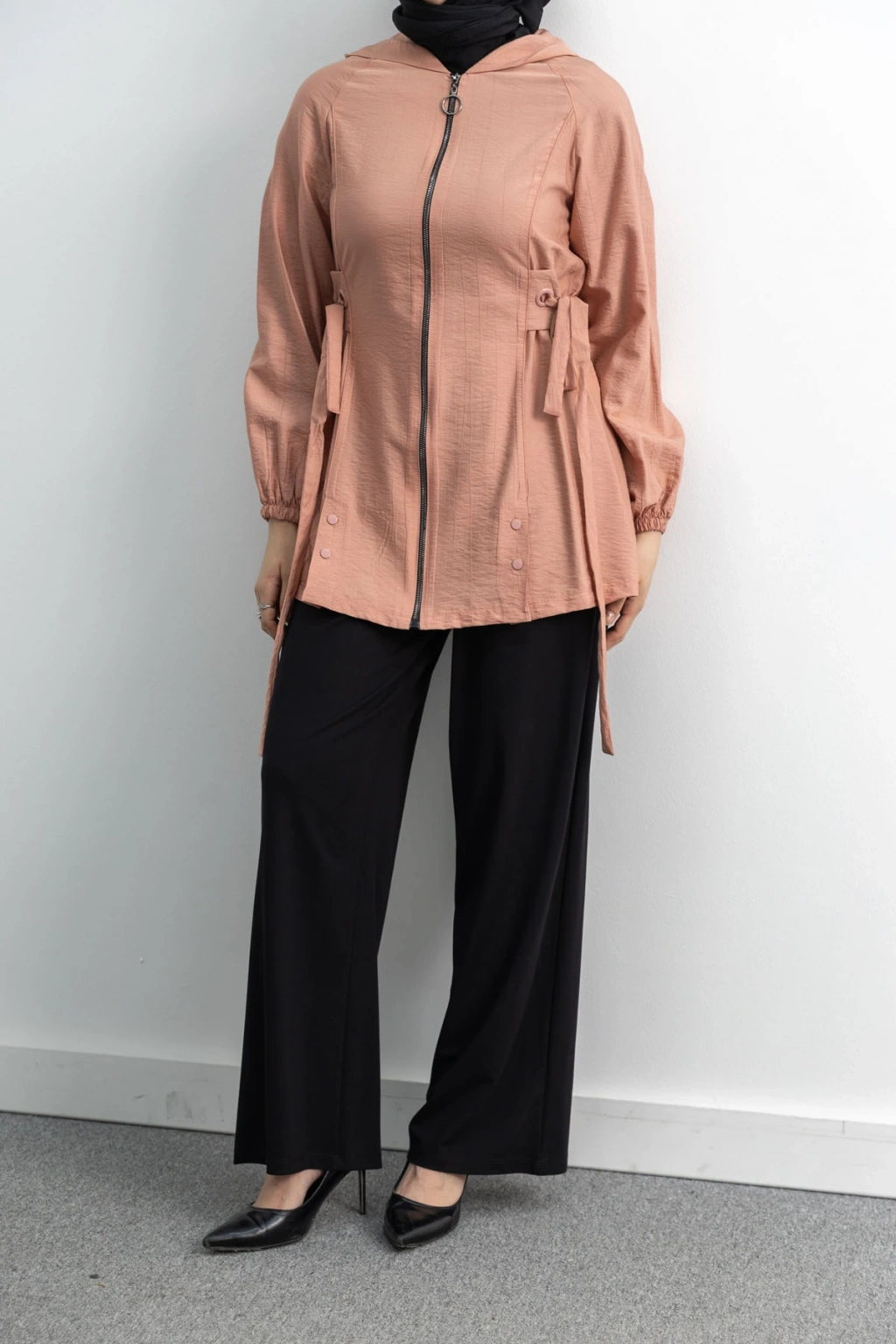 Letafet Şerit Detaylı Kapüşonlu Fermuarlı Ceket - GÜL, şıklığı ve rahatlığı bir araya getiren benzersiz bir tasarımdır. Yüksek kaliteli kumaşı ve zarif detayları ile hem günlük kullanıma hem de özel günlere uygun olarak tasarlanmıştır.