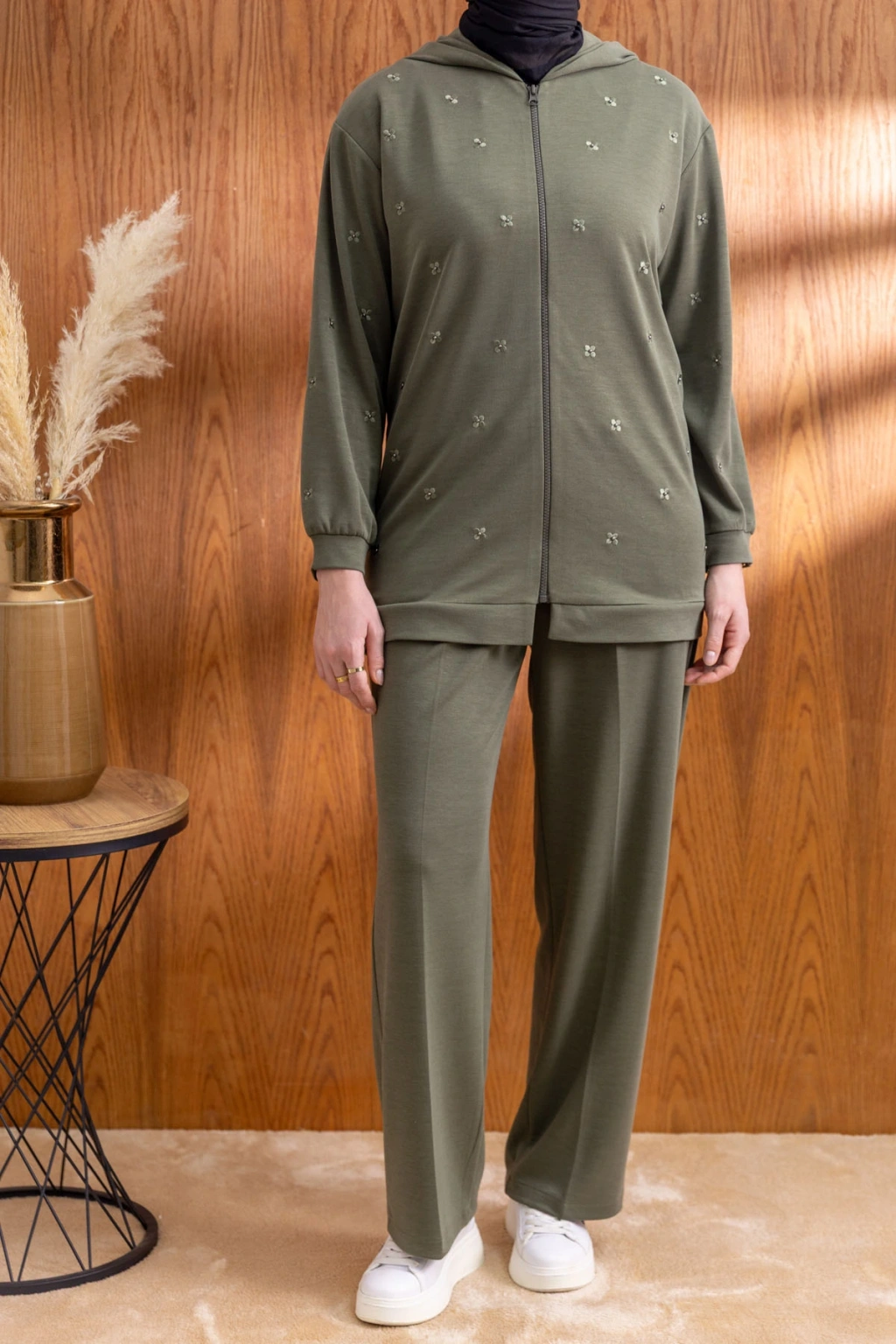 Ürün Adı: NAKIŞ VE İNCİ DETAYLI PANTOLONLU TAKIM - HAKİ